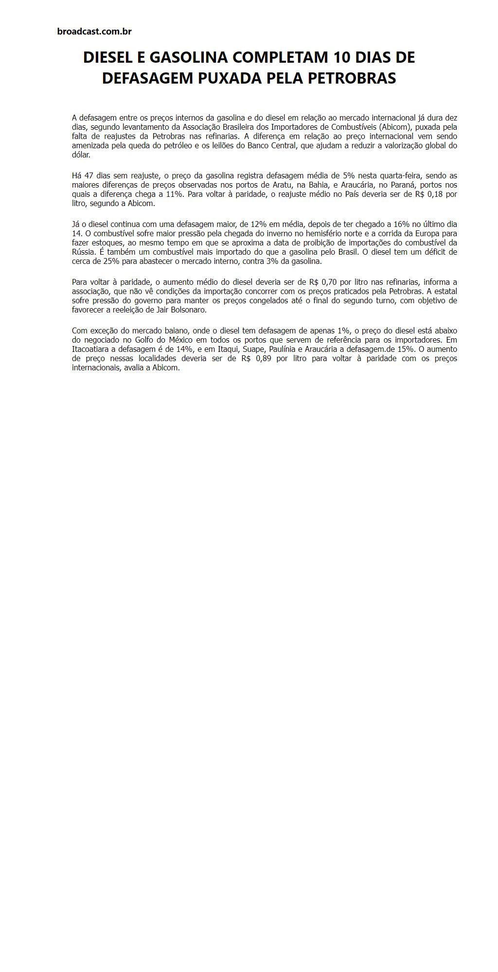 DIESEL E GASOLINA COMPLETAM 10 DIAS DE DEFASAGEM PUXADA PELA PETROBRAS