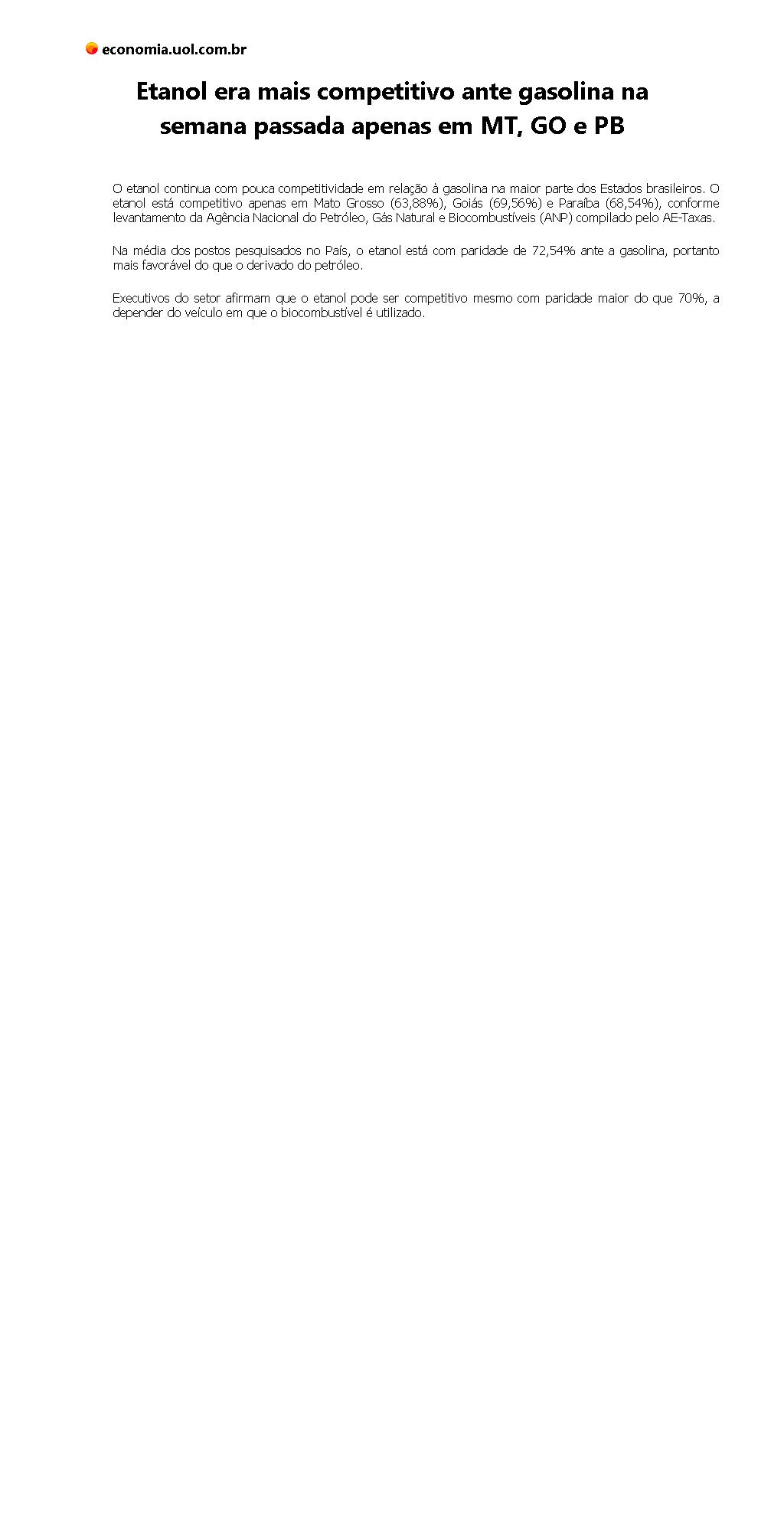 Etanol era mais competitivo ante gasolina na semana passada apenas em MT, GO e PB