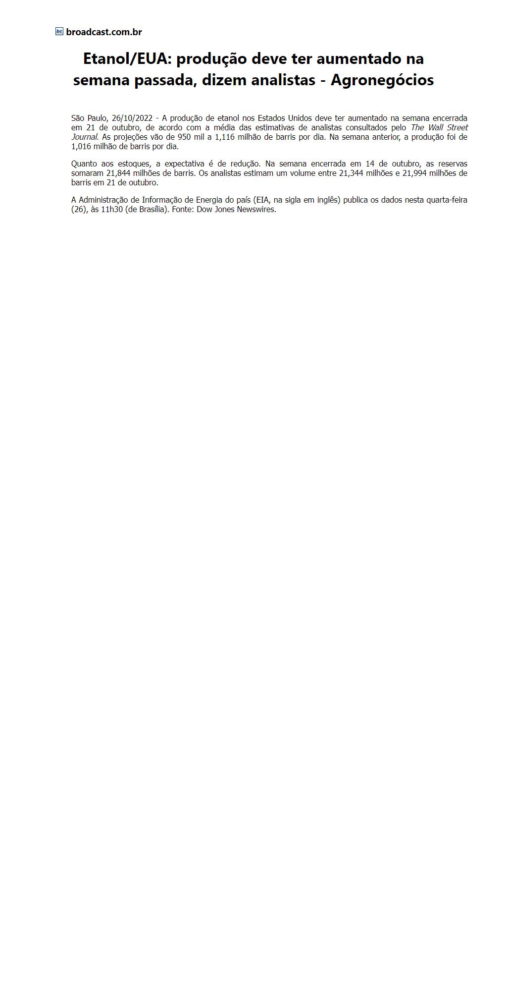 Etanol/EUA: produção deve ter aumentado na semana passada, dizem analistas