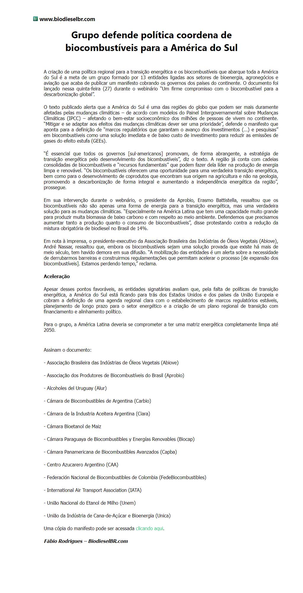 Grupo defende política coordena de biocombustíveis para a América do Sul