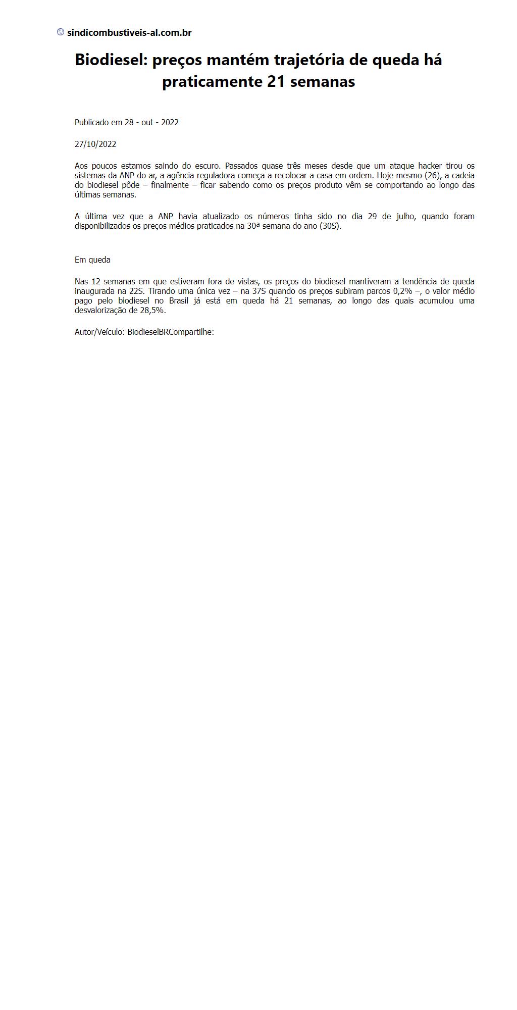 Biodiesel: preços mantém trajetória de queda há praticamente 21 semanas