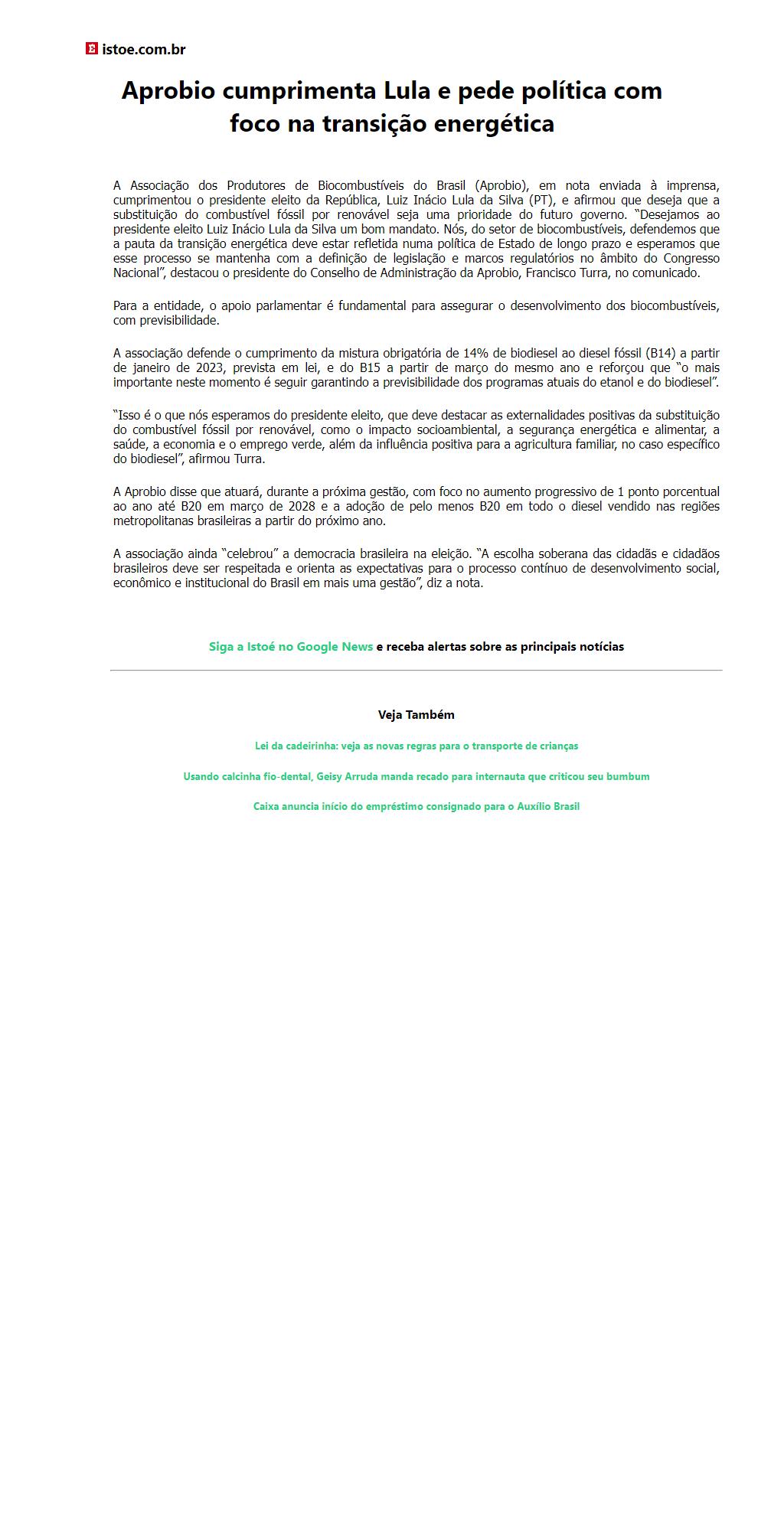 Aprobio cumprimenta Lula e pede política com foco na transição energética