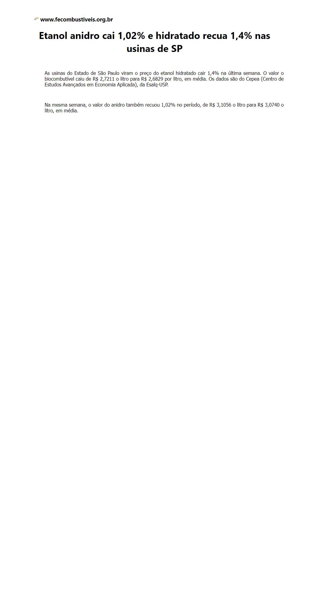 Etanol anidro cai 1,02% e hidratado recua 1,4% nas usinas de SP