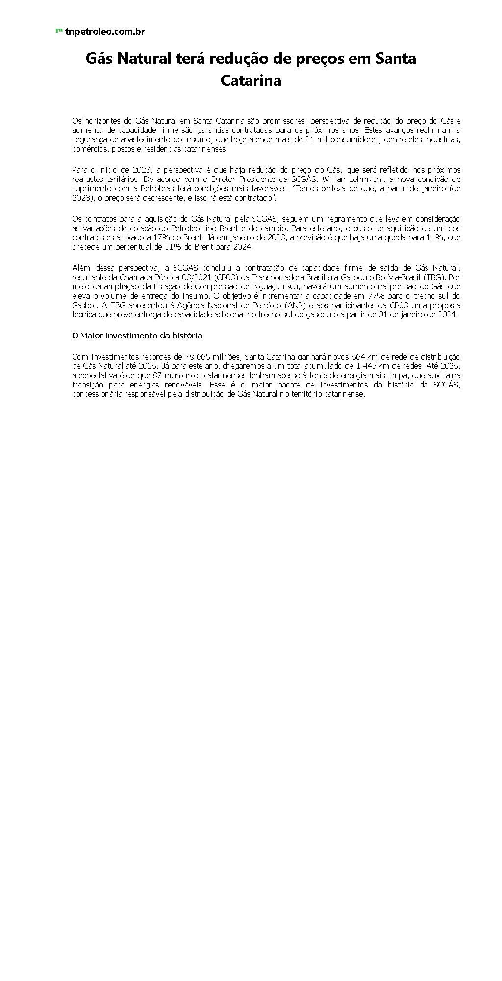 Gás Natural terá redução de preços em Santa Catarina