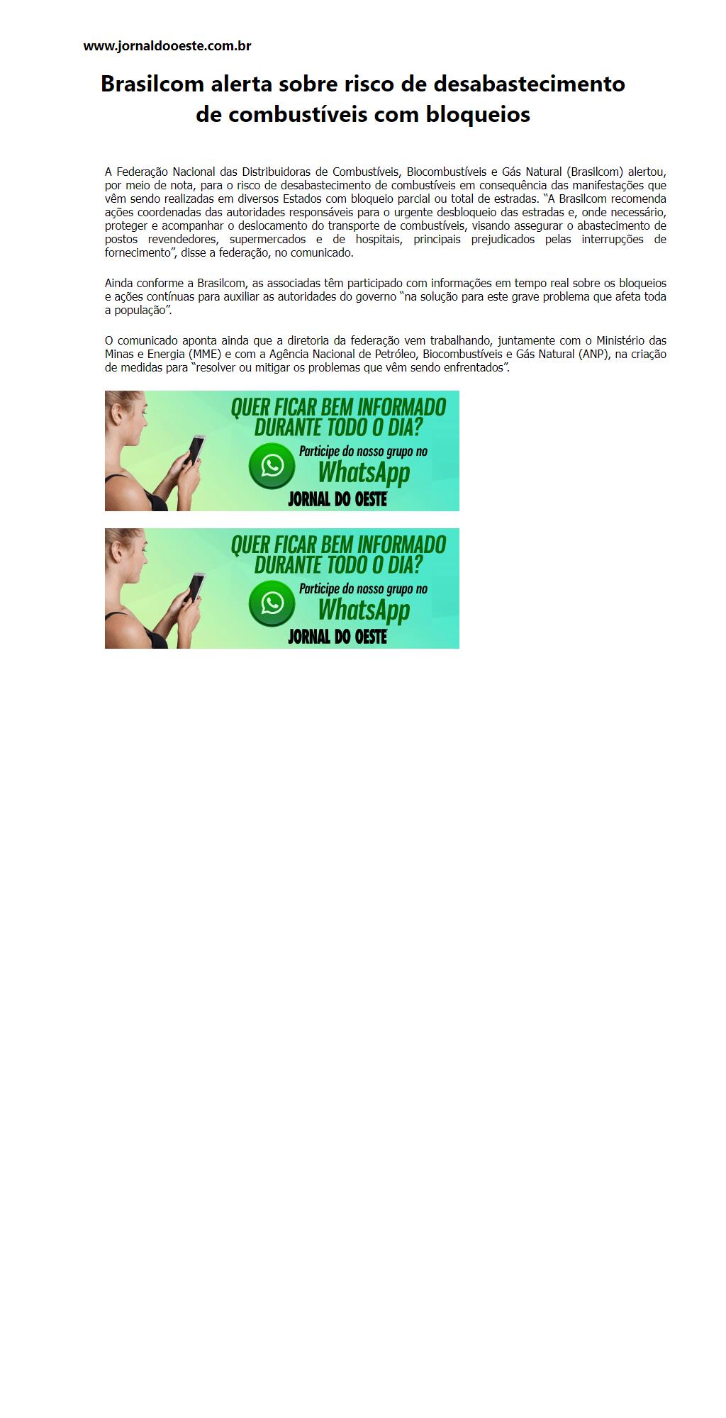 Brasilcom alerta sobre risco de desabastecimento de combustíveis com bloqueios