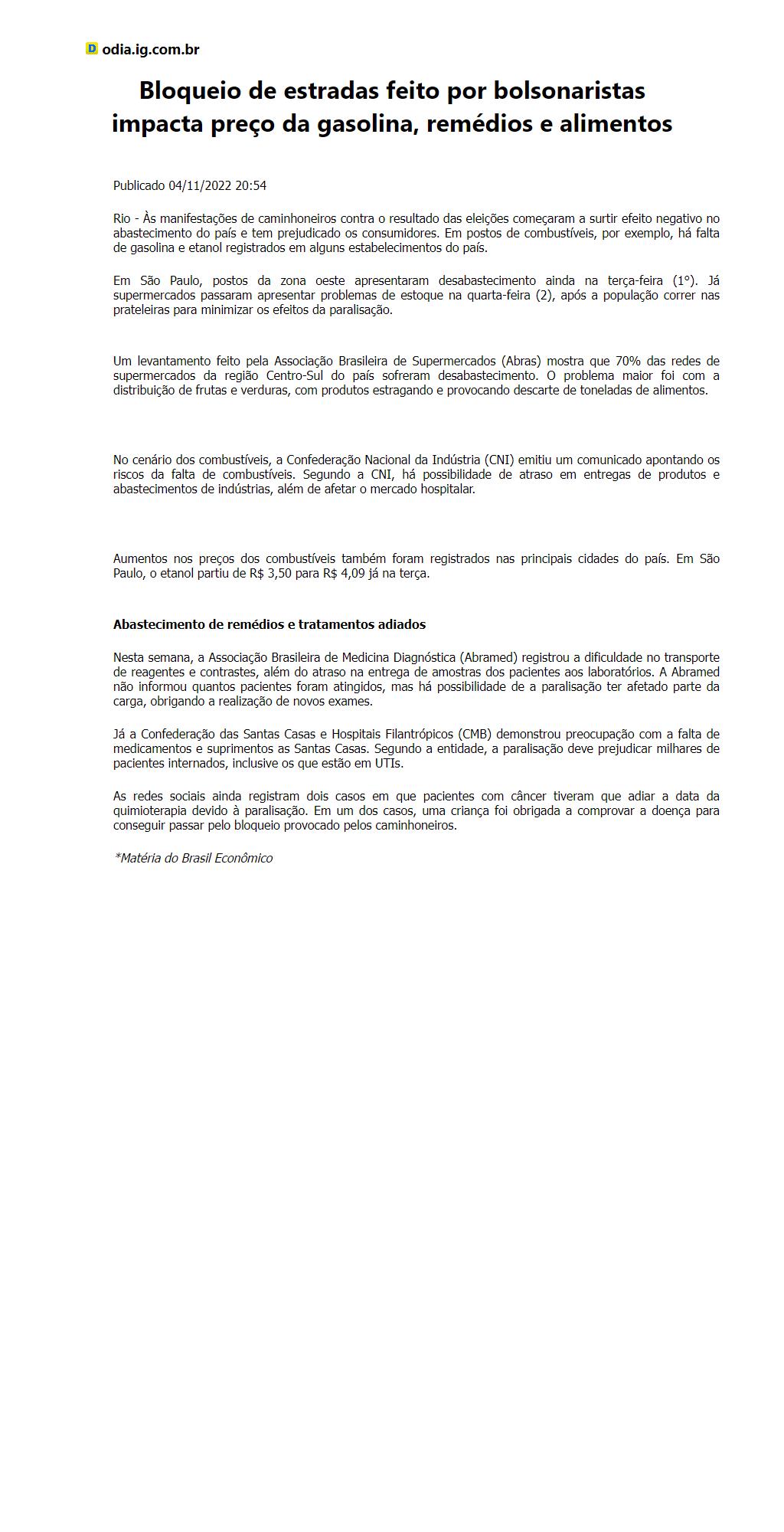 Bloqueio de estradas feito por bolsonaristas impacta preço da gasolina, remédios e alimentos