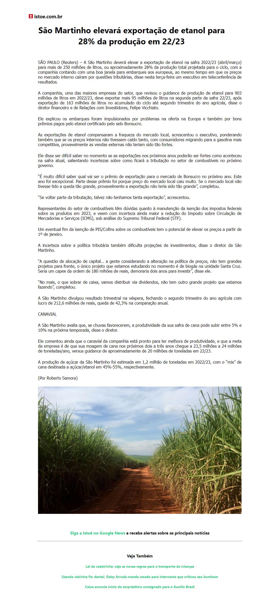 São Martinho elevará exportação de etanol para 28% da produção em 22/23