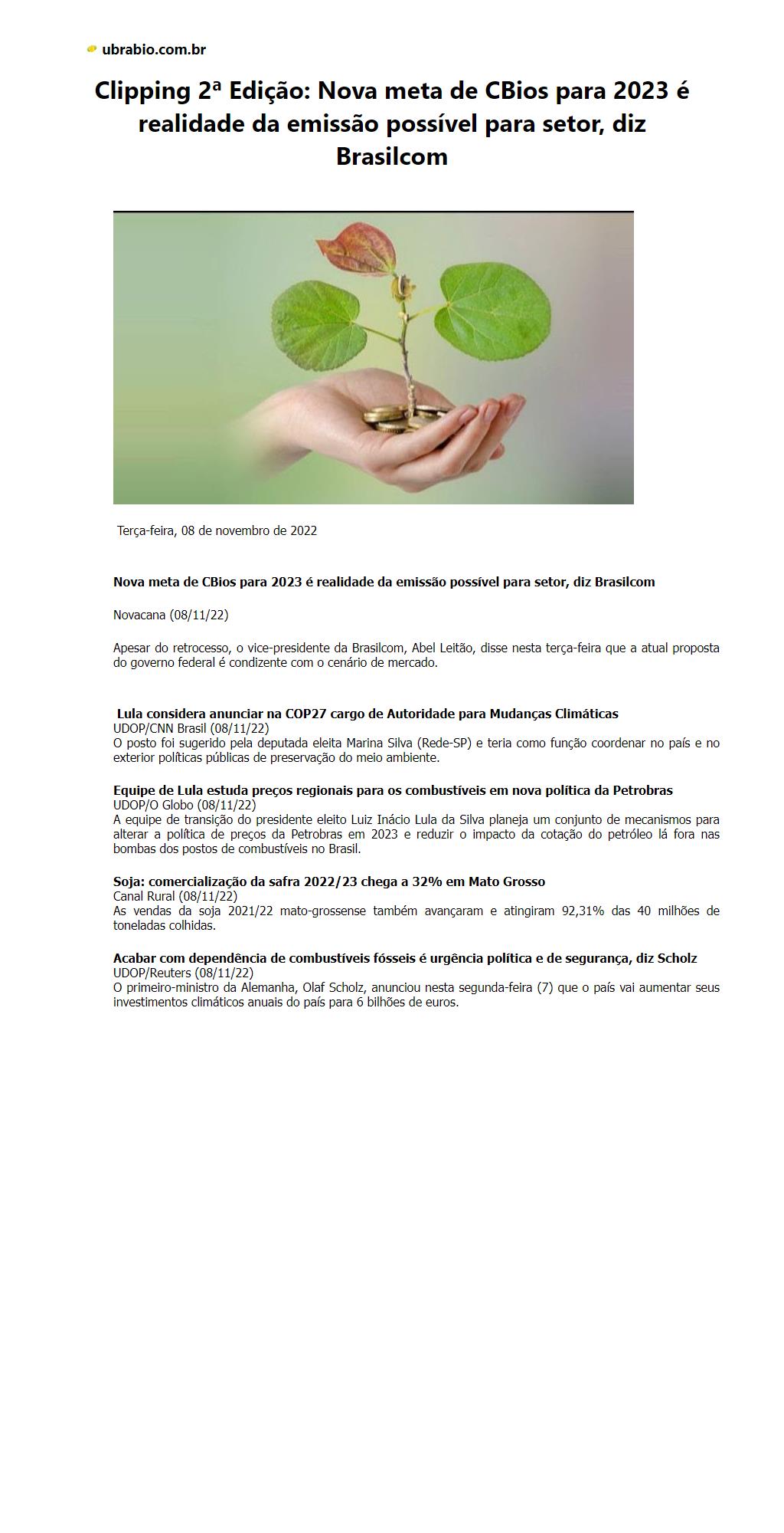 Clipping 2ª Edição: Nova meta de CBios para 2023 é realidade da emissão possível para setor, diz Brasilcom