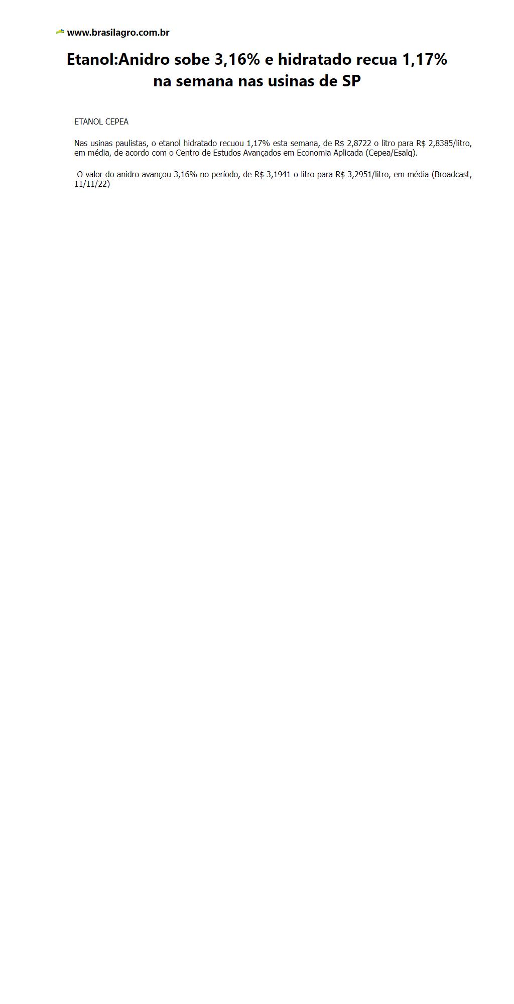 Etanol:Anidro sobe 3,16% e hidratado recua 1,17% na semana nas usinas de SP