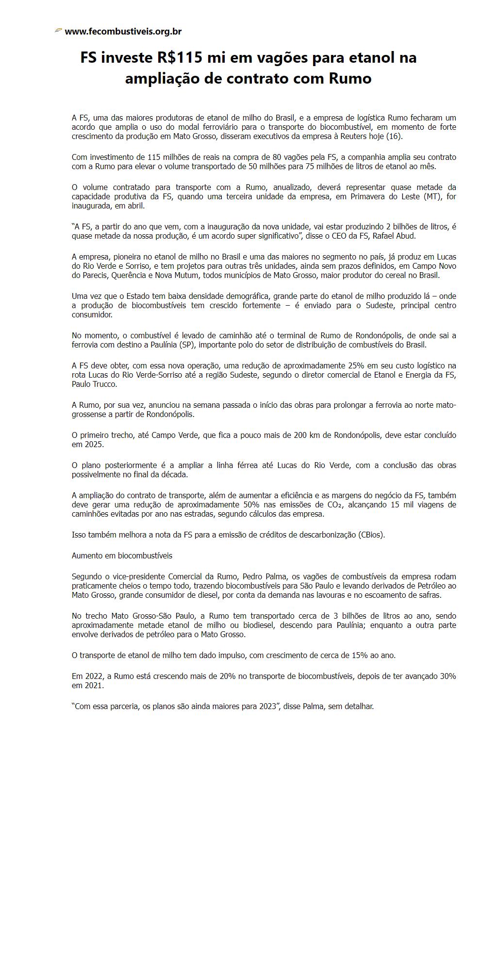 FS investe R$115 mi em vagões para etanol na ampliação de contrato com Rumo