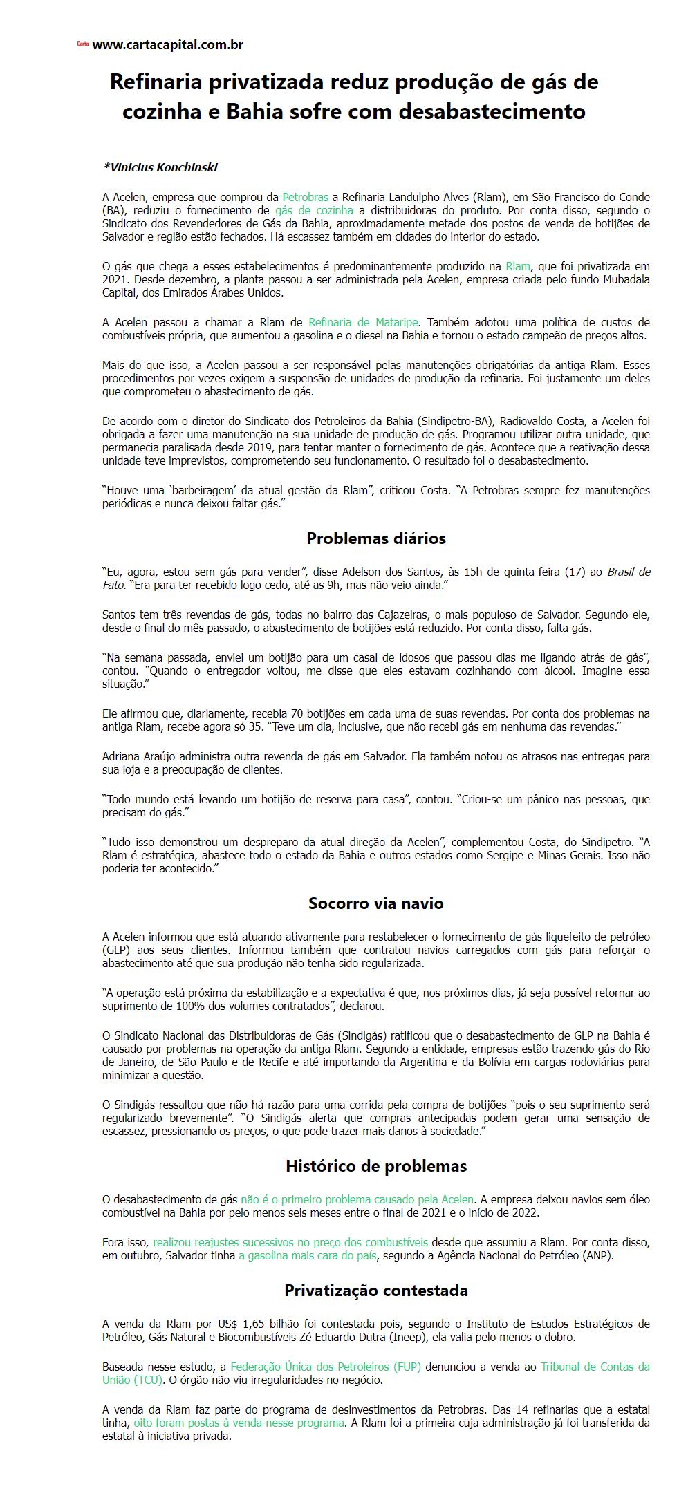 Refinaria privatizada reduz produção de gás de cozinha e Bahia sofre com desabastecimento