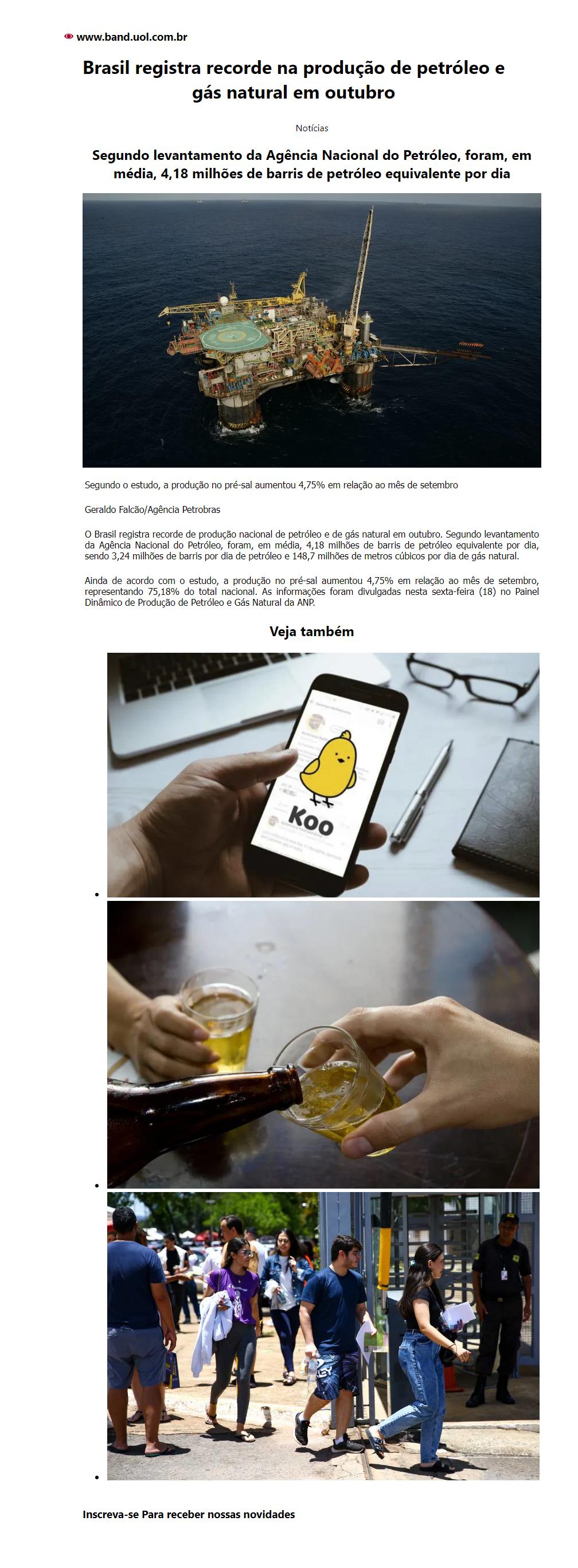 Brasil registra recorde na produção de petróleo e gás natural em outubro