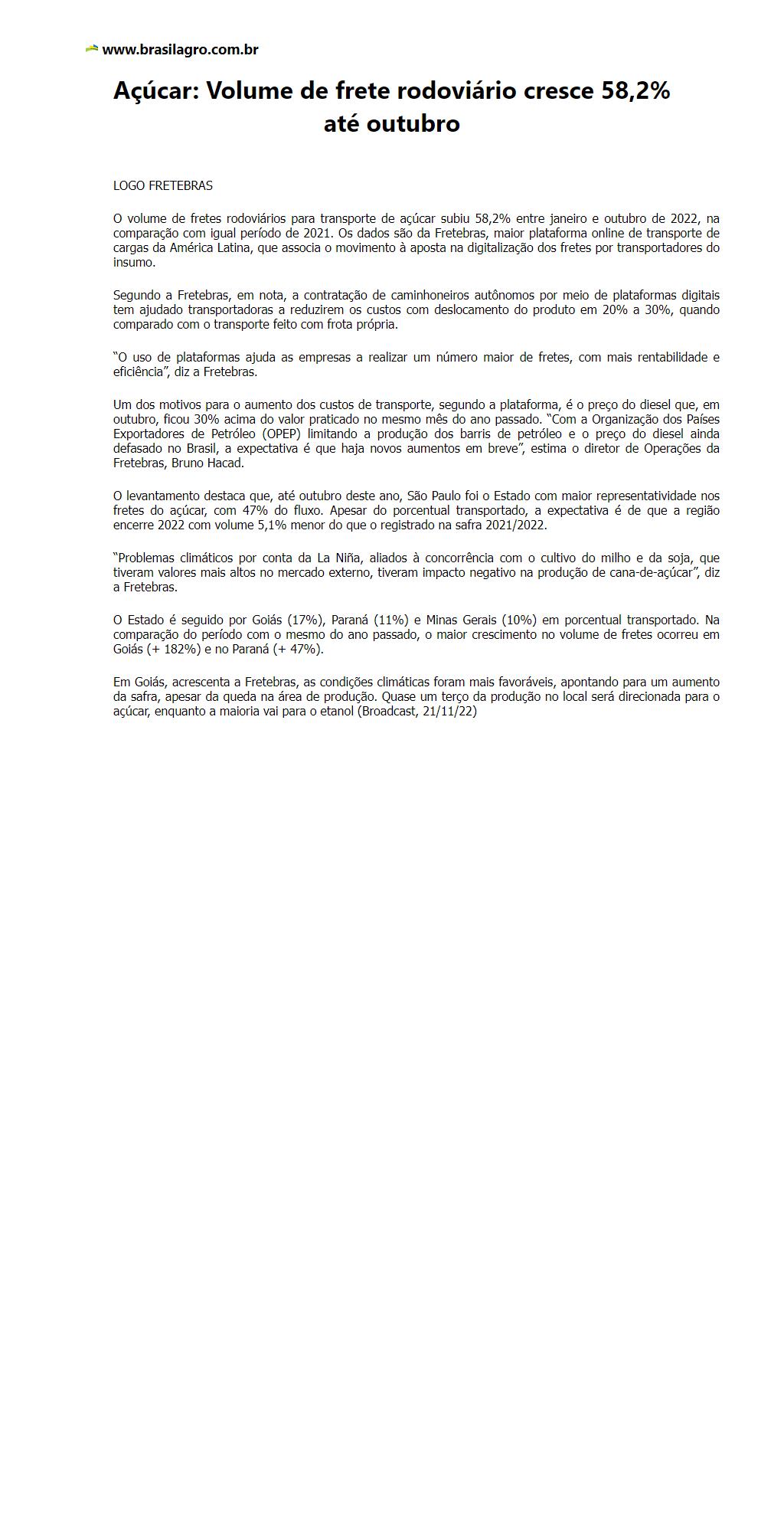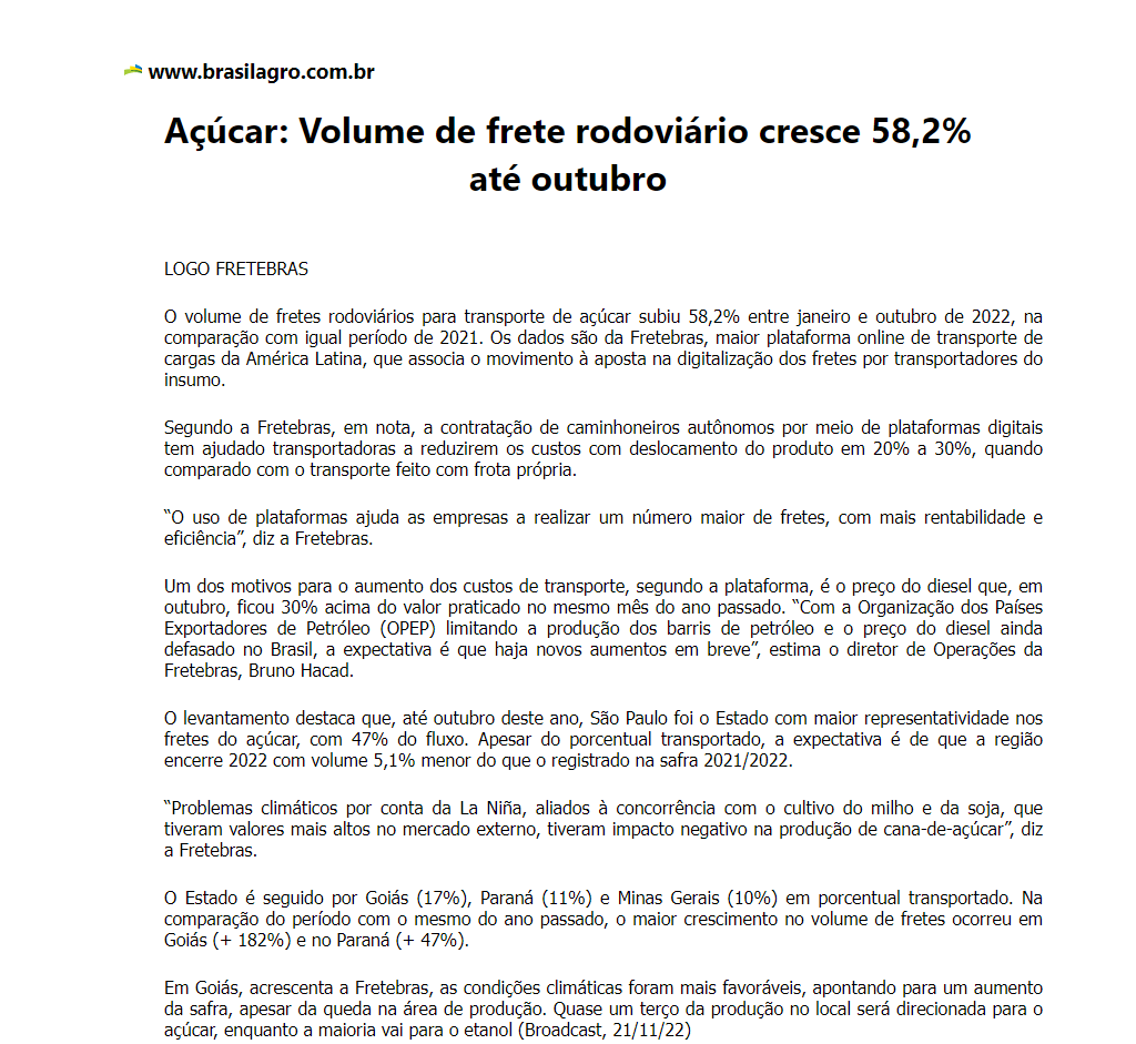 Açúcar: Volume de frete rodoviário cresce 58,2% até outubro