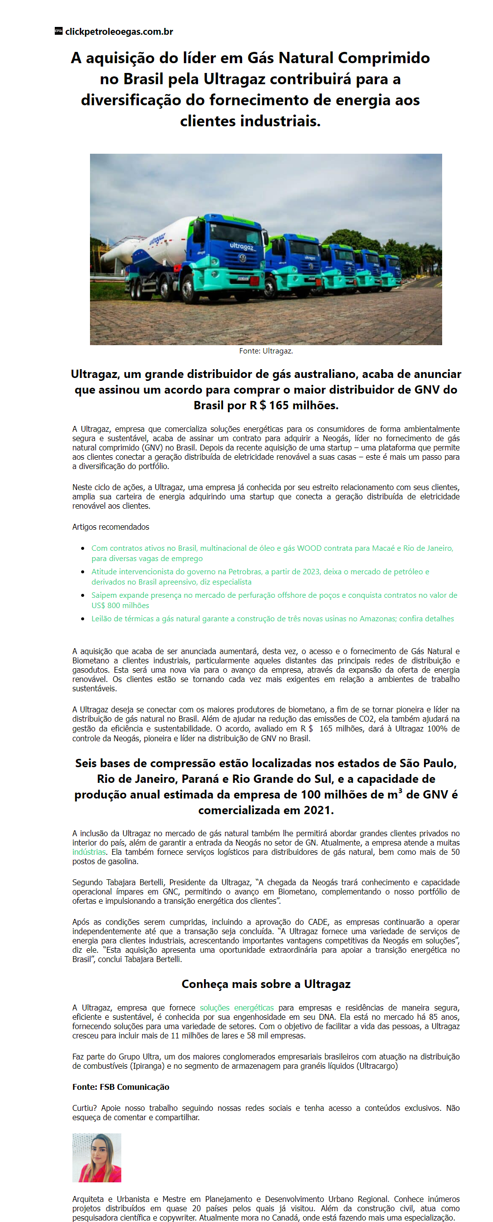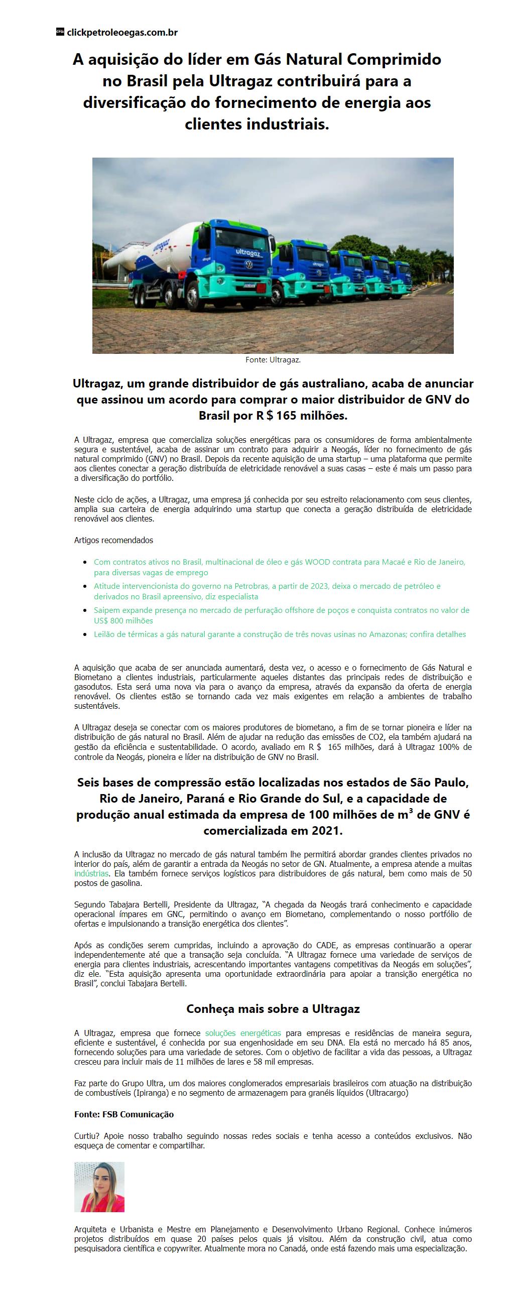 A aquisição do líder em Gás Natural Comprimido no Brasil pela Ultragaz contribuirá para a diversificação do fornecimento