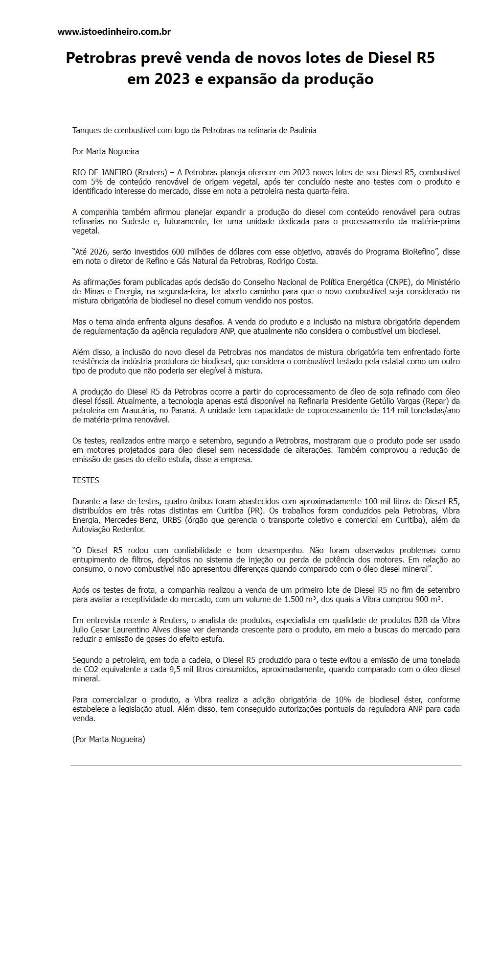 Petrobras prevê venda de novos lotes de Diesel R5 em 2023 e expansão da produção