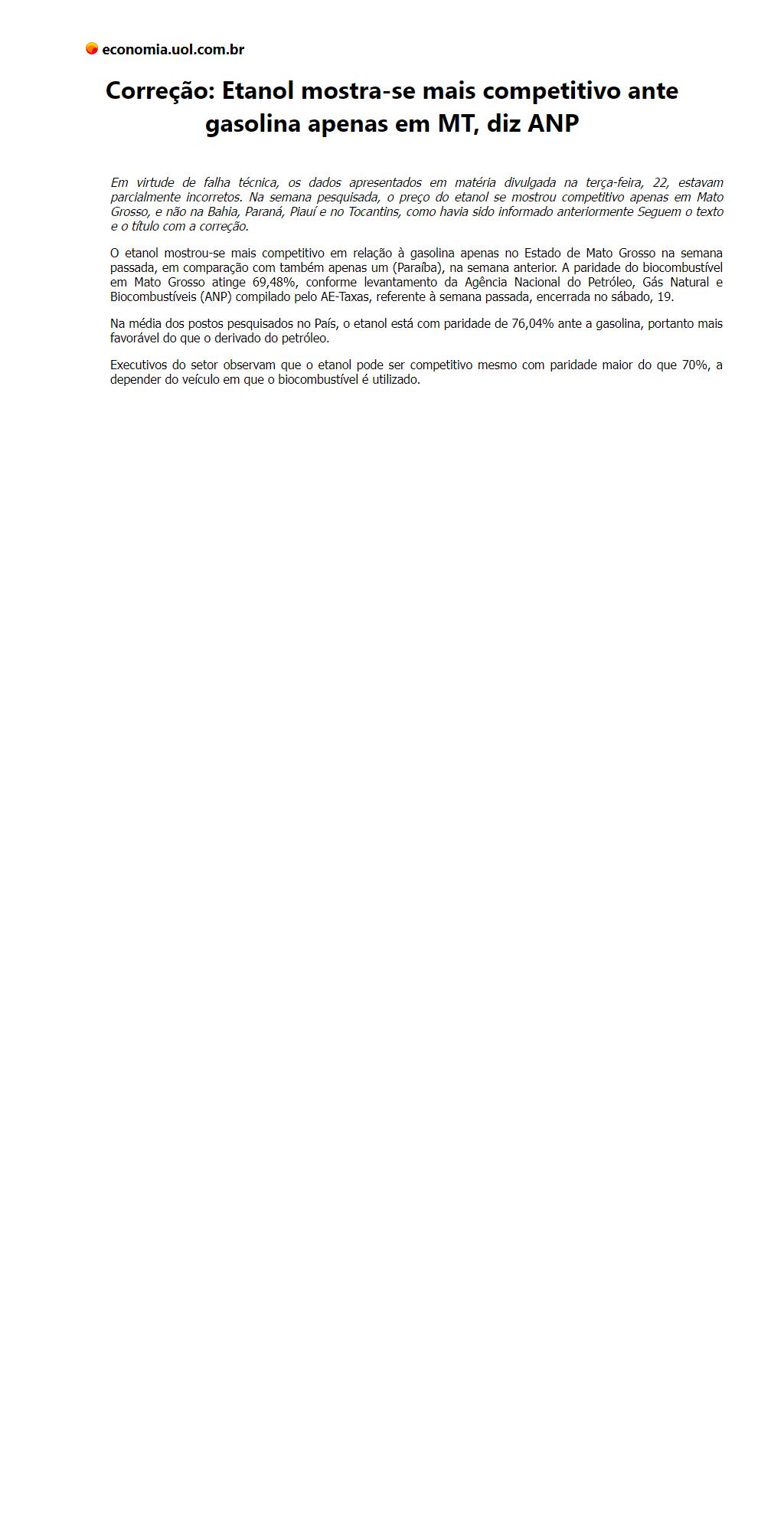 Correção: Etanol mostra-se mais competitivo ante gasolina apenas em MT, diz ANP