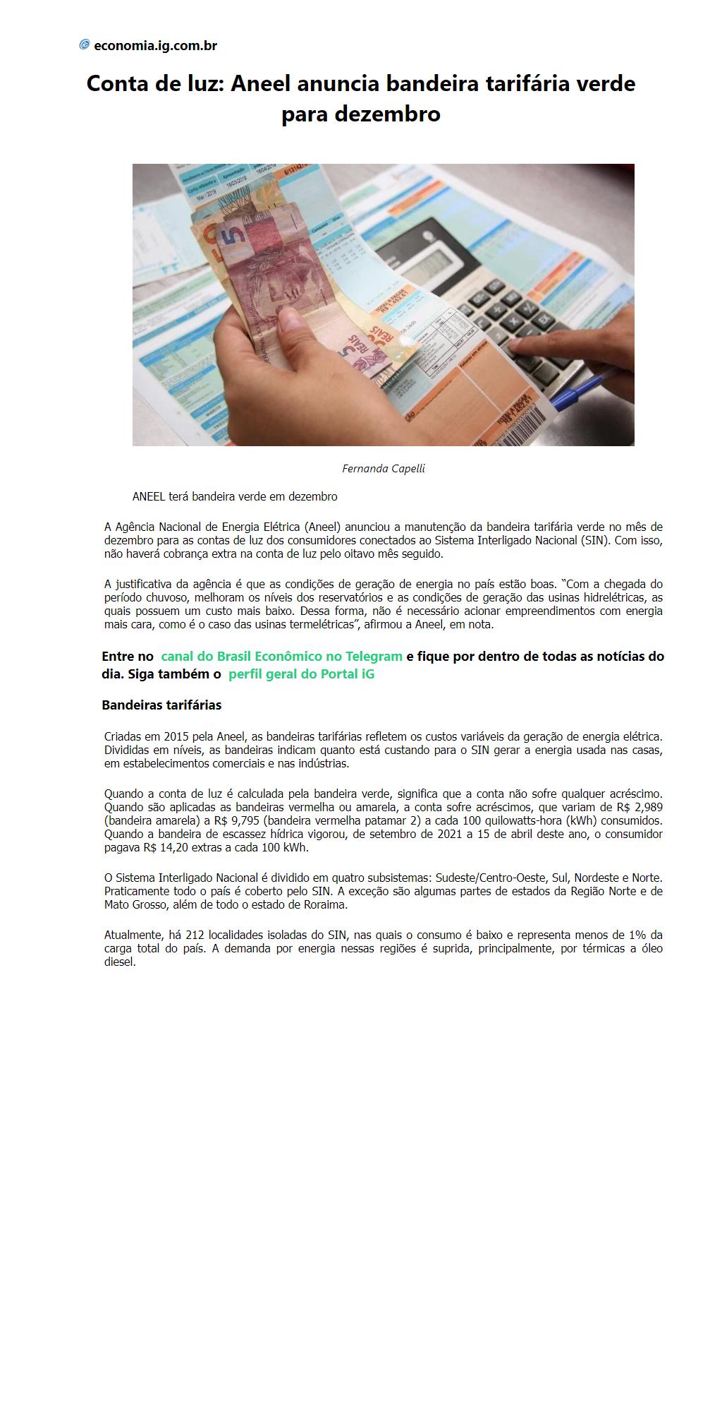 Conta de luz: Aneel anuncia bandeira tarifária verde para dezembro