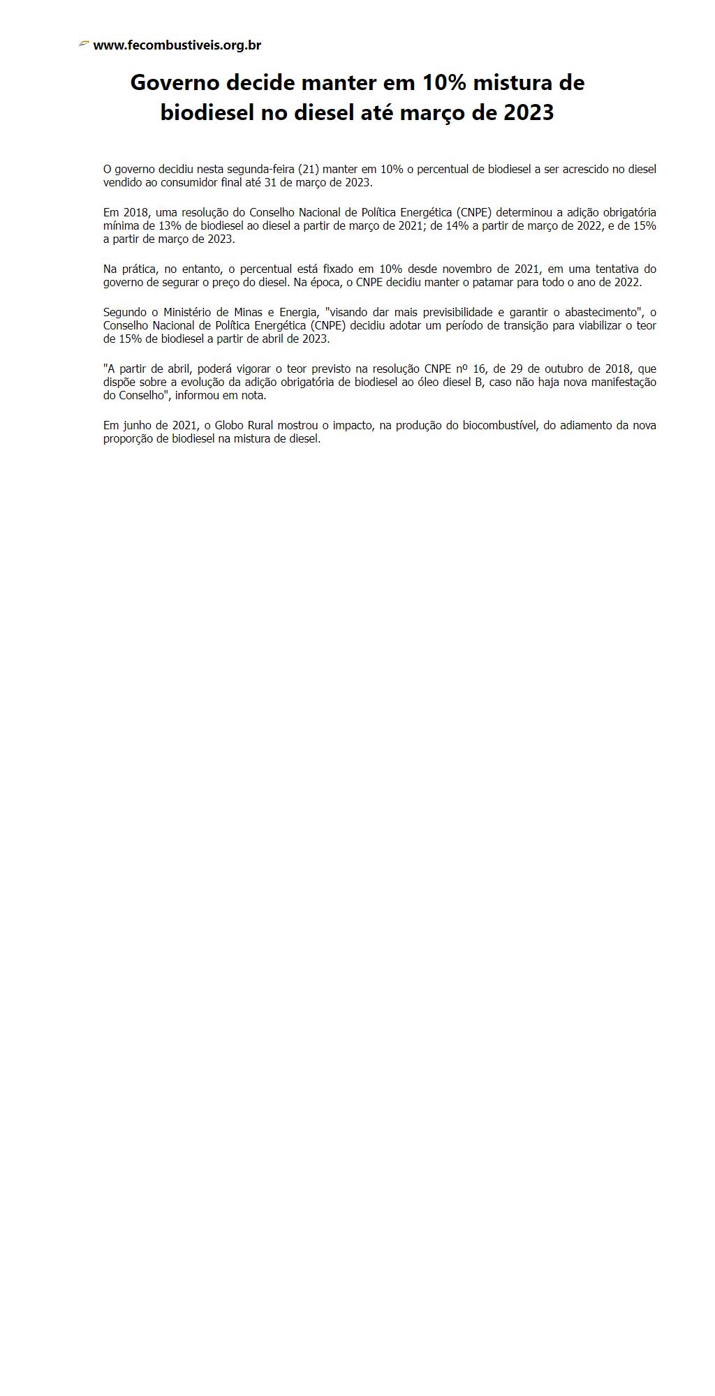 Governo decide manter em 10% mistura de biodiesel no diesel até março de 2023