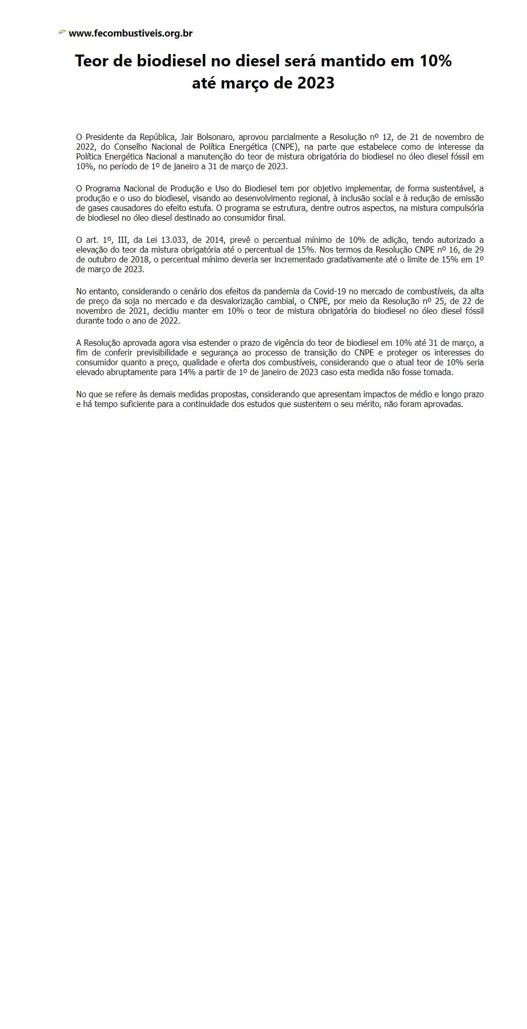 Teor de biodiesel no diesel será mantido em 10% até março de 2023