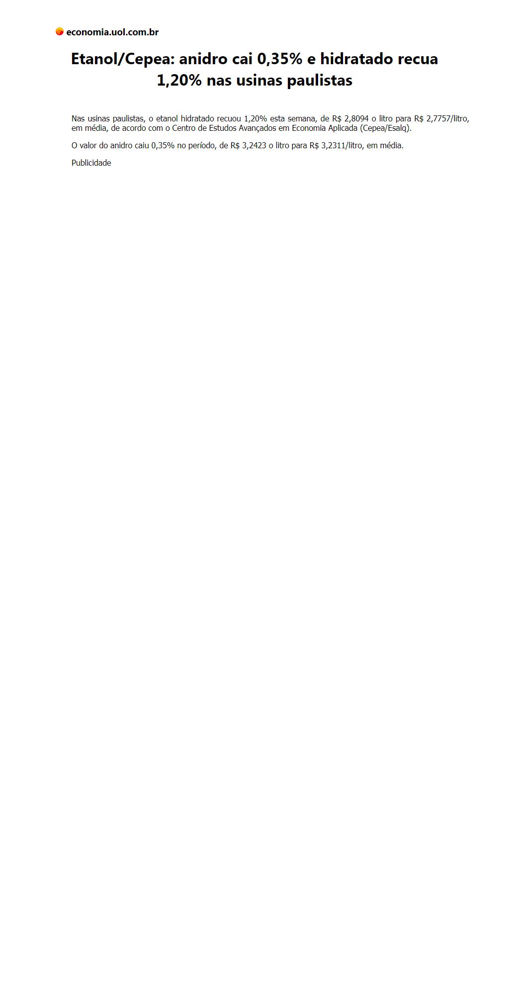 Etanol/Cepea: anidro cai 0,35% e hidratado recua 1,20% nas usinas paulistas