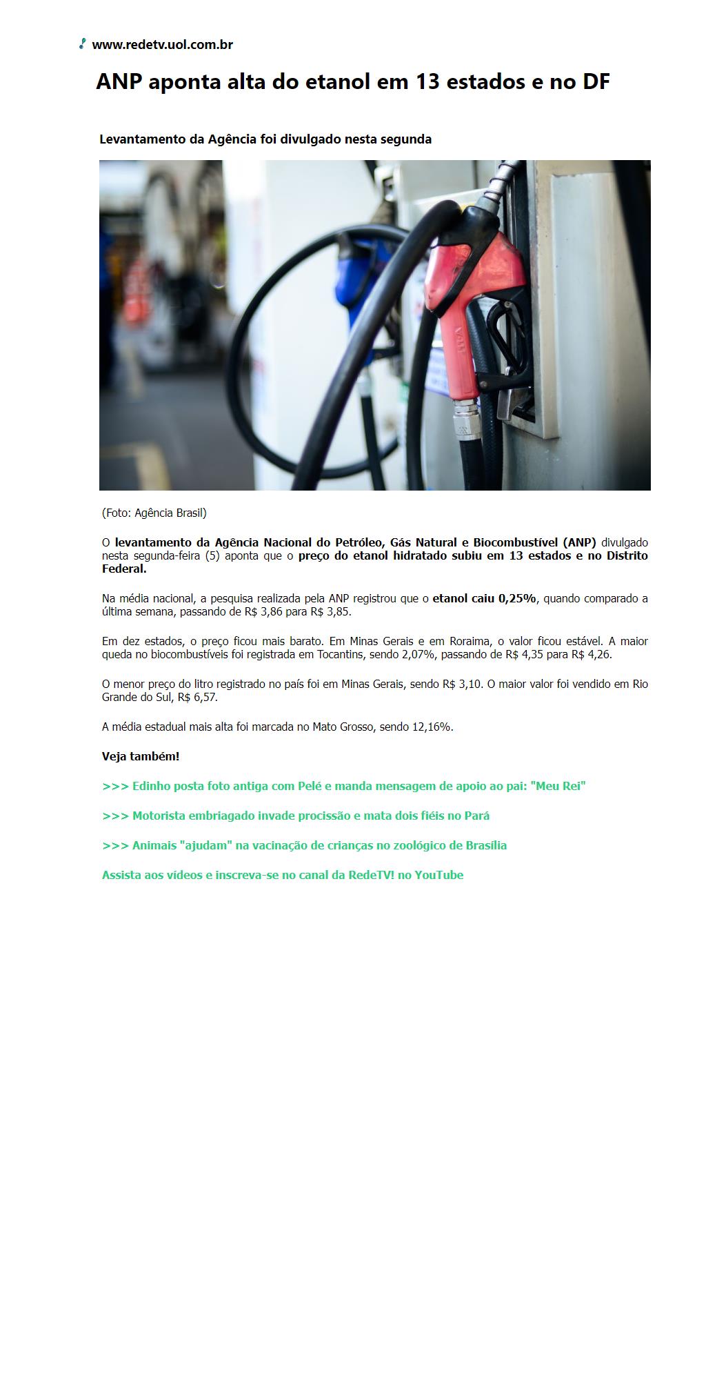 ANP aponta alta do etanol em 13 estados e no DF