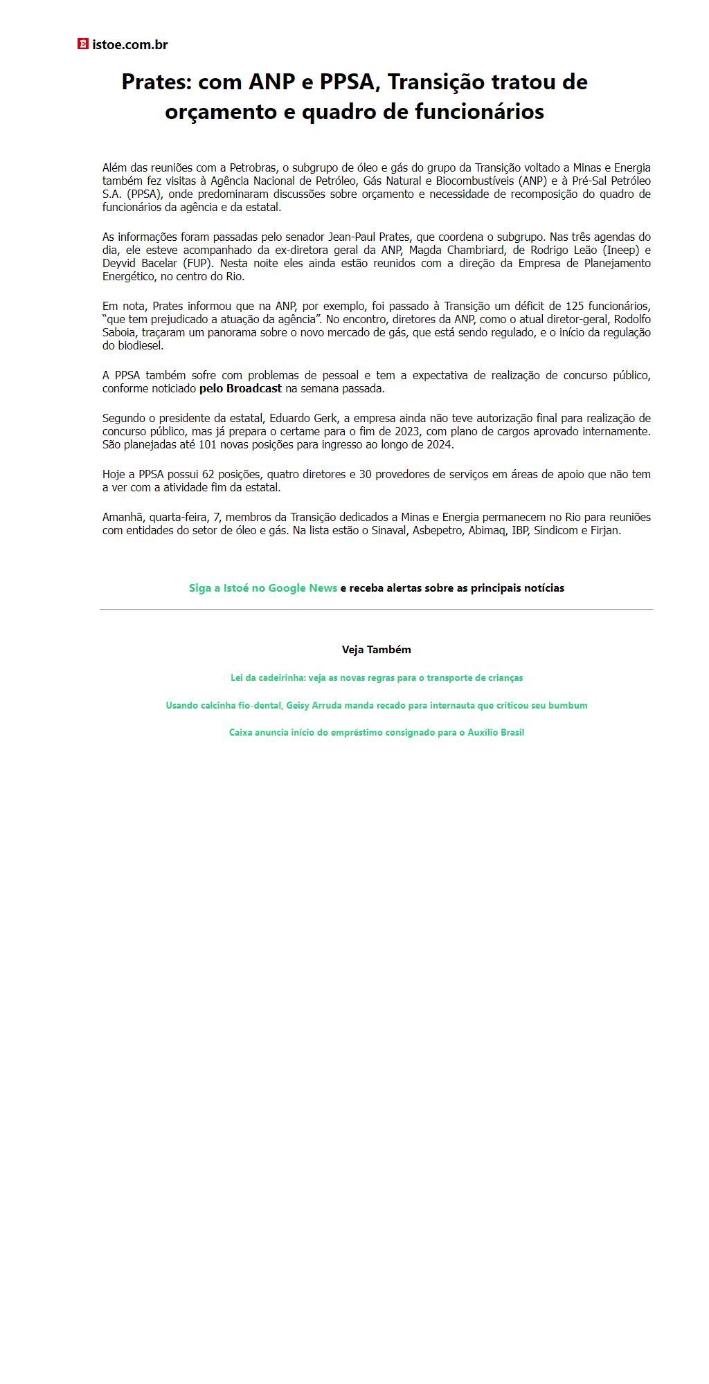 Em nota, Prates informou que na ANP, por exemplo, foi passado à Transição um déficit de 125 funcionários, “que tem prejudicado a atuação da agência”. No encontro, diretores da ANP, como o atual diretor-geral, Rodolfo Saboia, traçaram um panorama sobre o novo mercado de gás, que está sendo regulado, e o início da regulação do biodiesel.