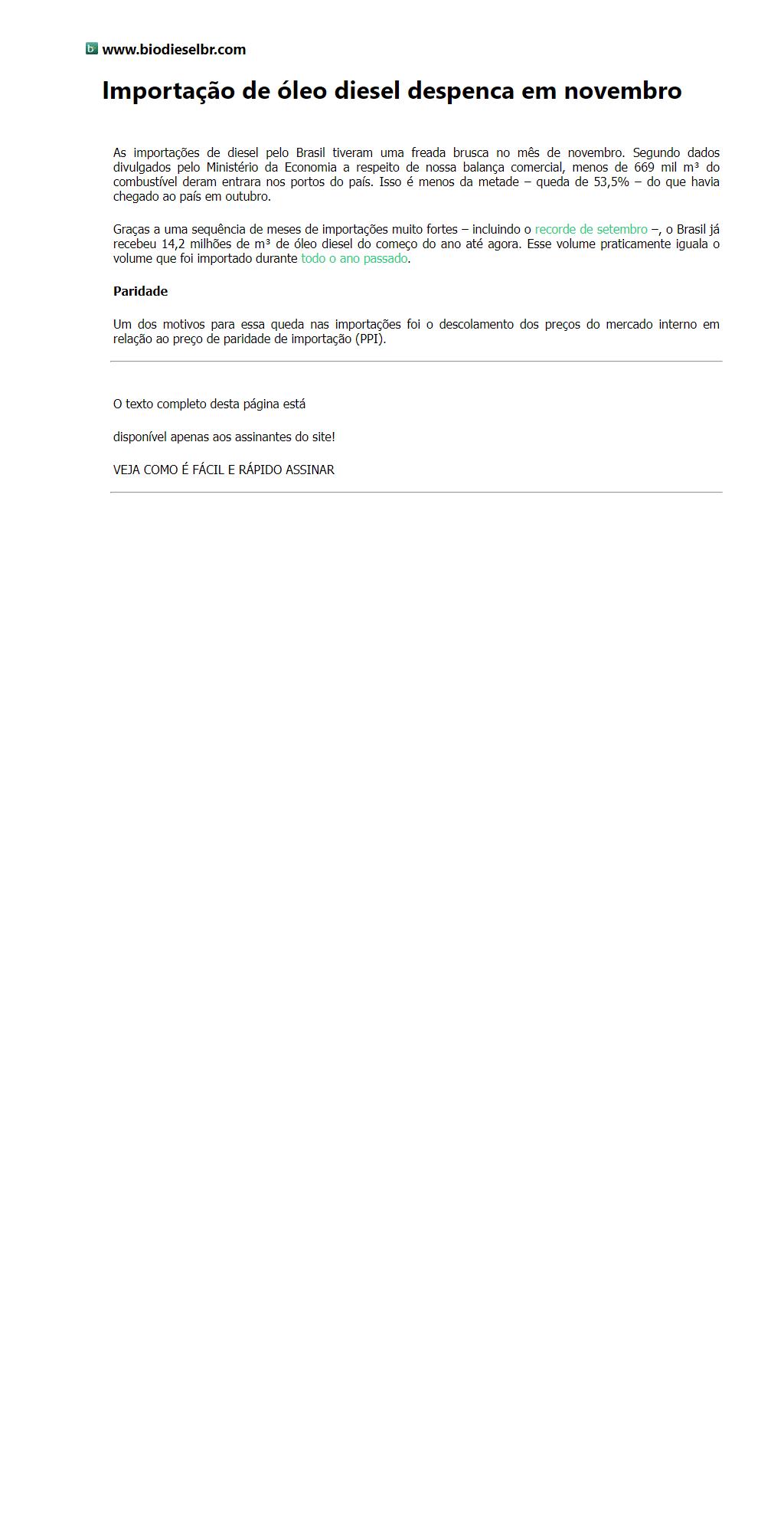 Importação de óleo diesel despenca em novembro