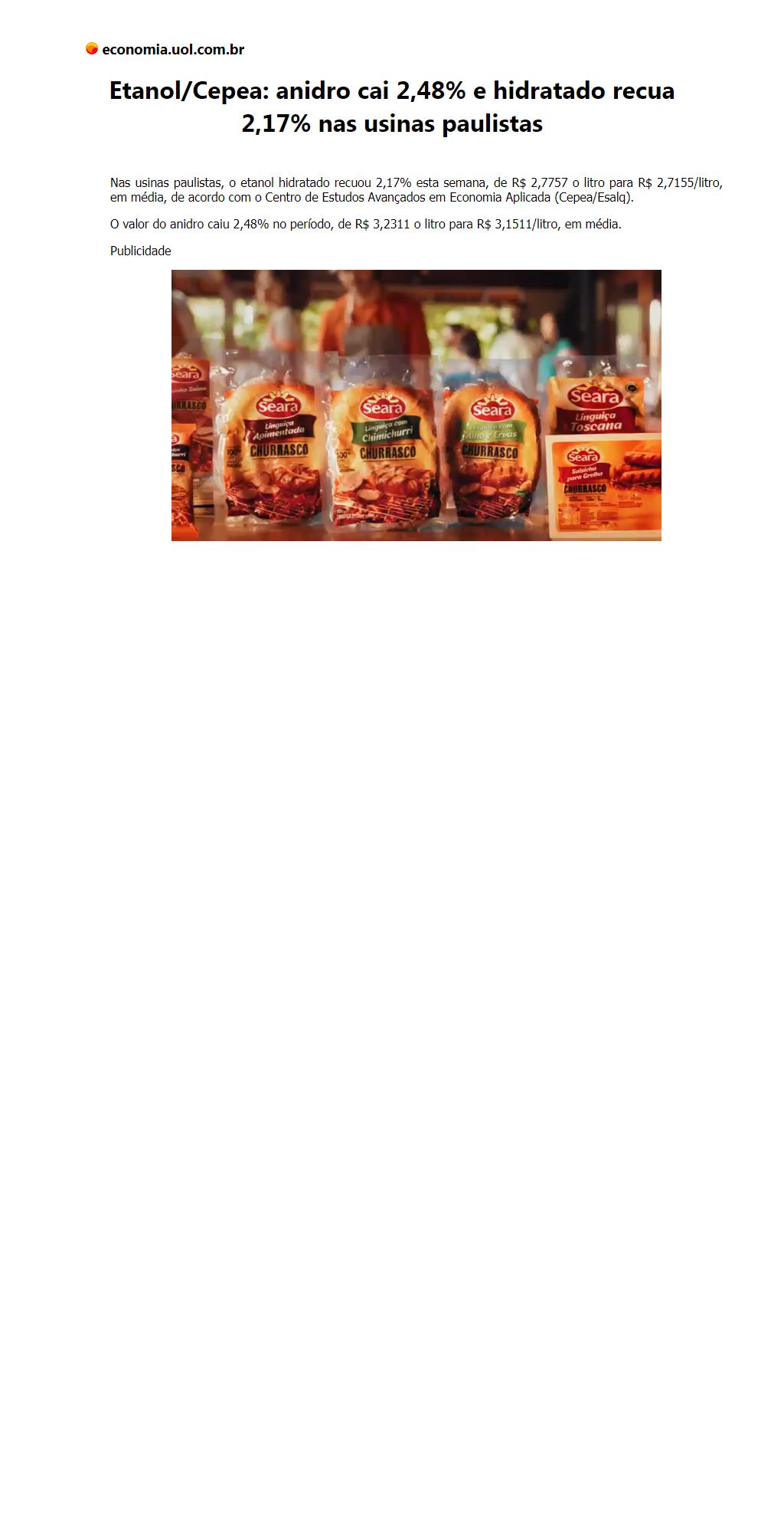 Etanol/Cepea: anidro cai 2,48% e hidratado recua 2,17% nas usinas paulistas