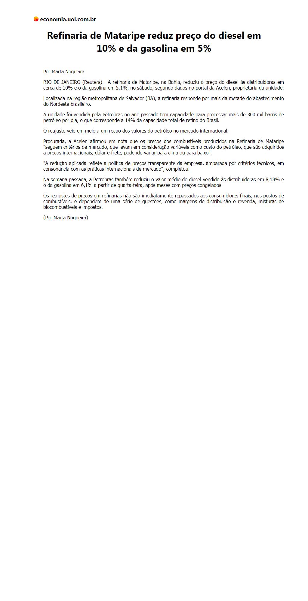 Refinaria de Mataripe reduz preço do diesel em 10% e da gasolina em 5%