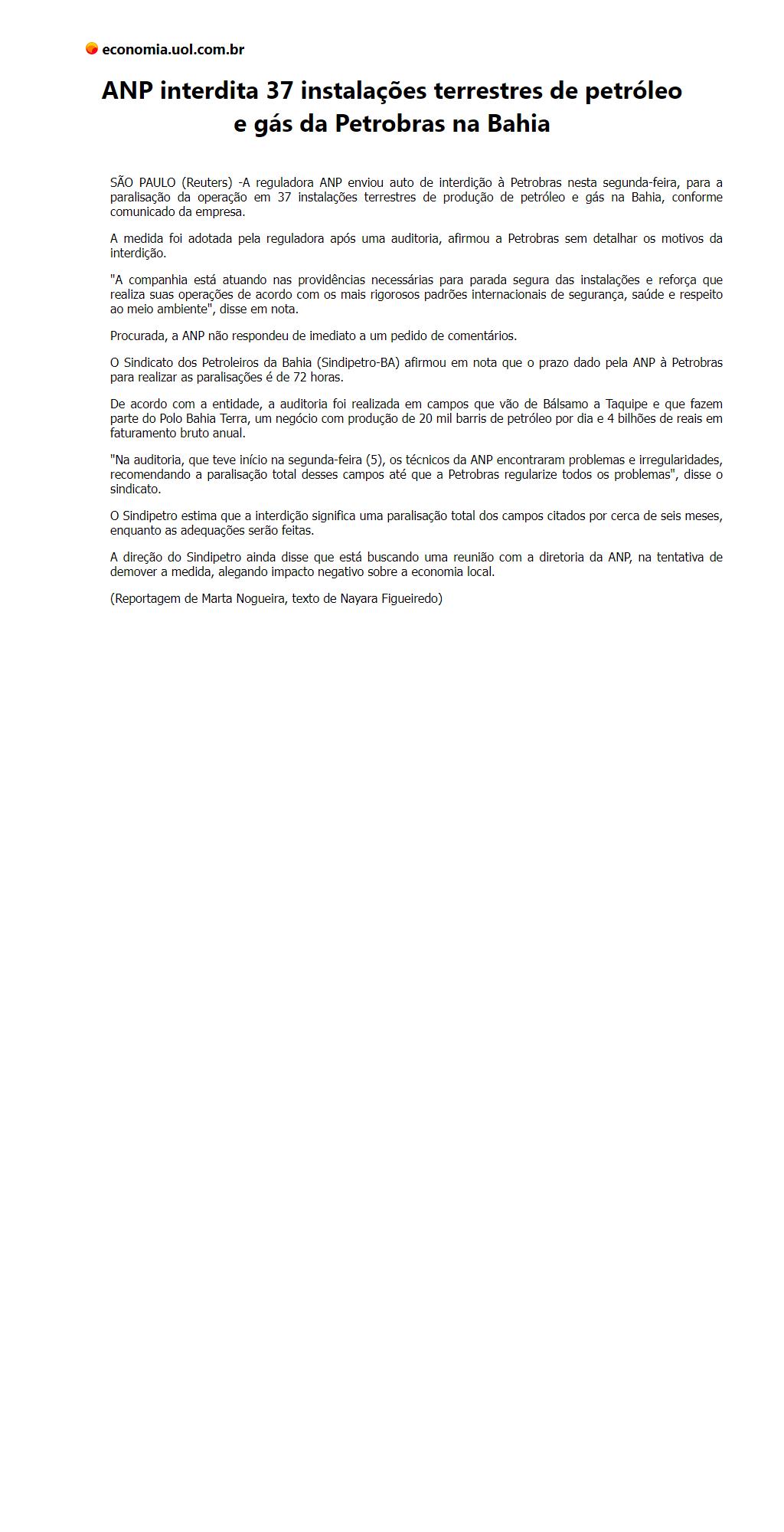 ANP interdita 37 instalações terrestres de petróleo e gás da Petrobras na Bahia