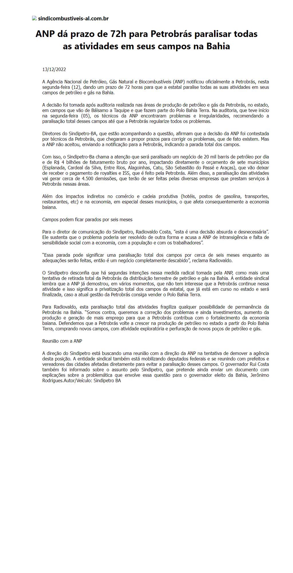 ANP dá prazo de 72h para Petrobrás paralisar todas as atividades em seus campos na Bahia