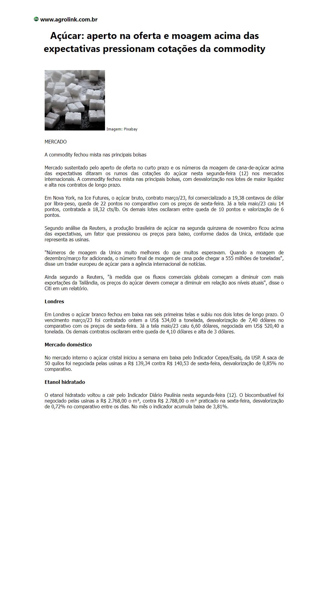 Açúcar: aperto na oferta e moagem acima das expectativas pressionam cotações da commodity
