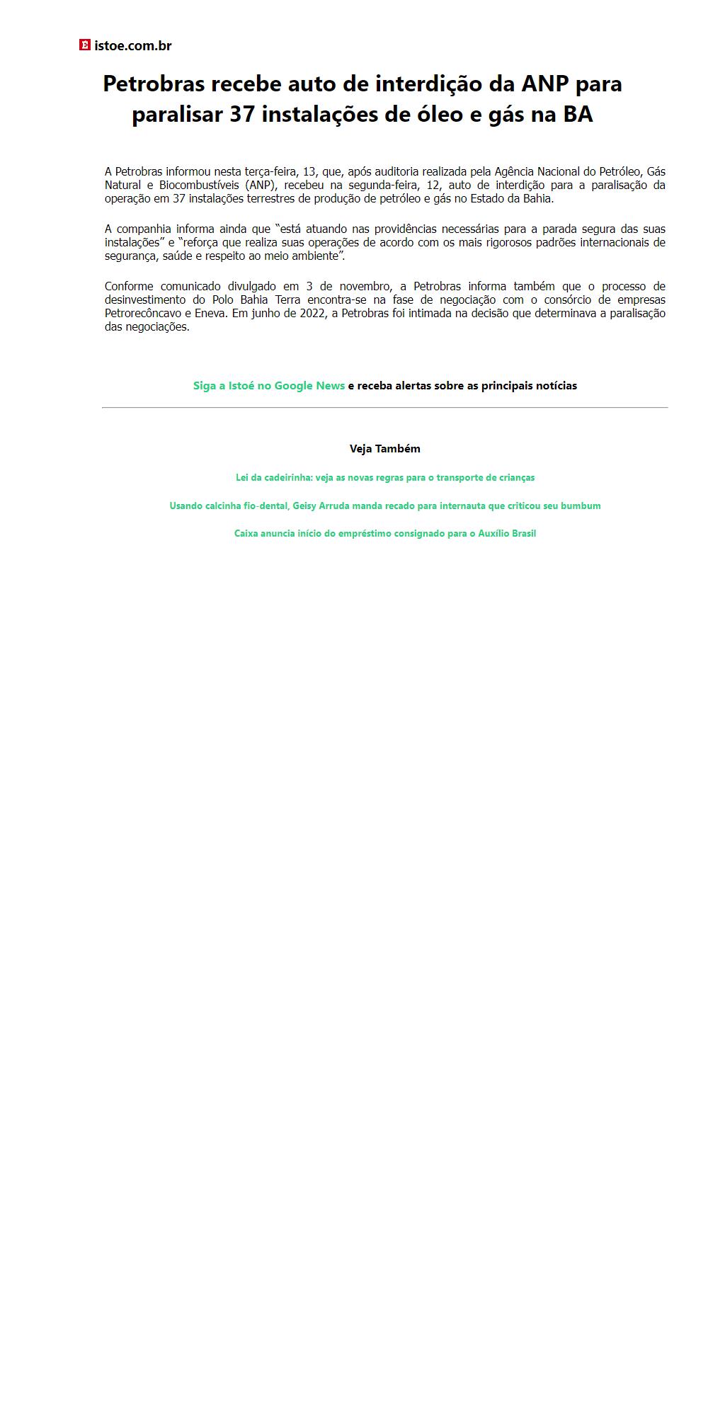 Petrobras recebe auto de interdição da ANP para paralisar 37 instalações de óleo e gás na BA