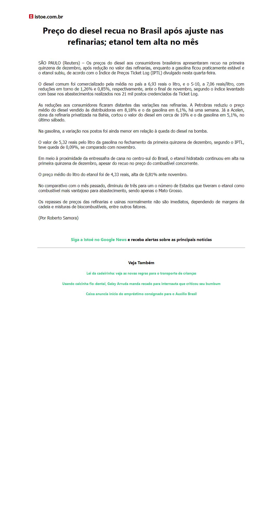 Preço do diesel recua no Brasil após ajuste nas refinarias; etanol tem alta no mês