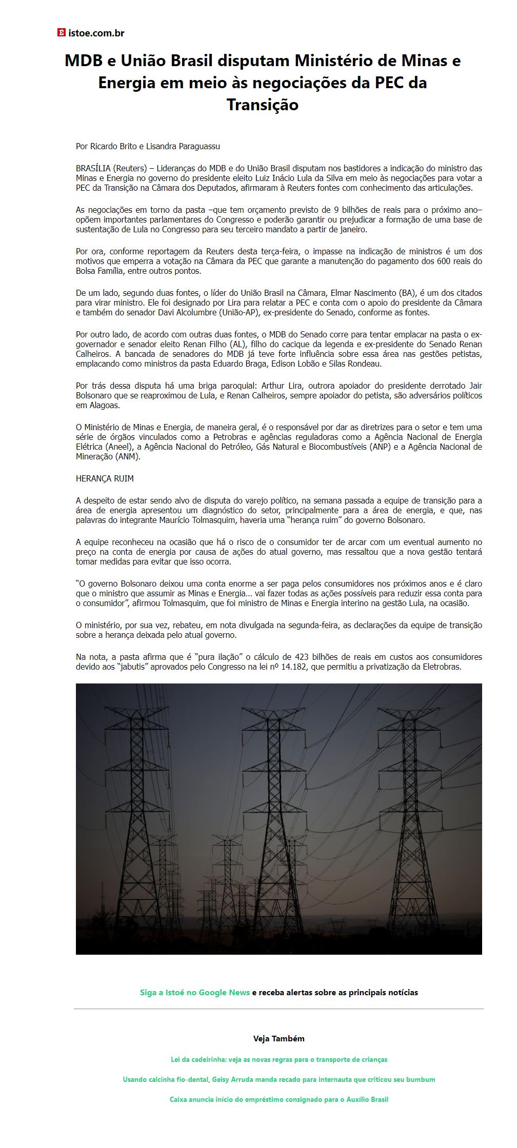 MDB e União Brasil disputam Ministério de Minas e Energia em meio às negociações da PEC da Transição