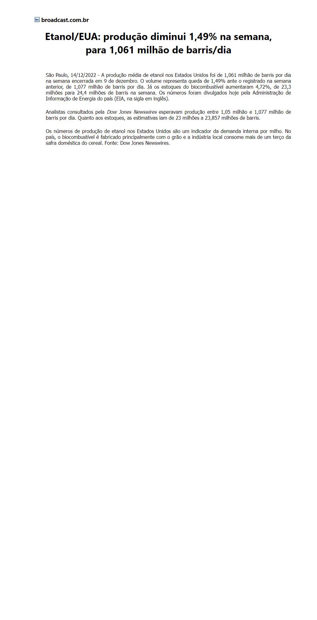 Etanol/EUA: produção diminui 1,49% na semana, para 1,061 milhão de barris/dia
