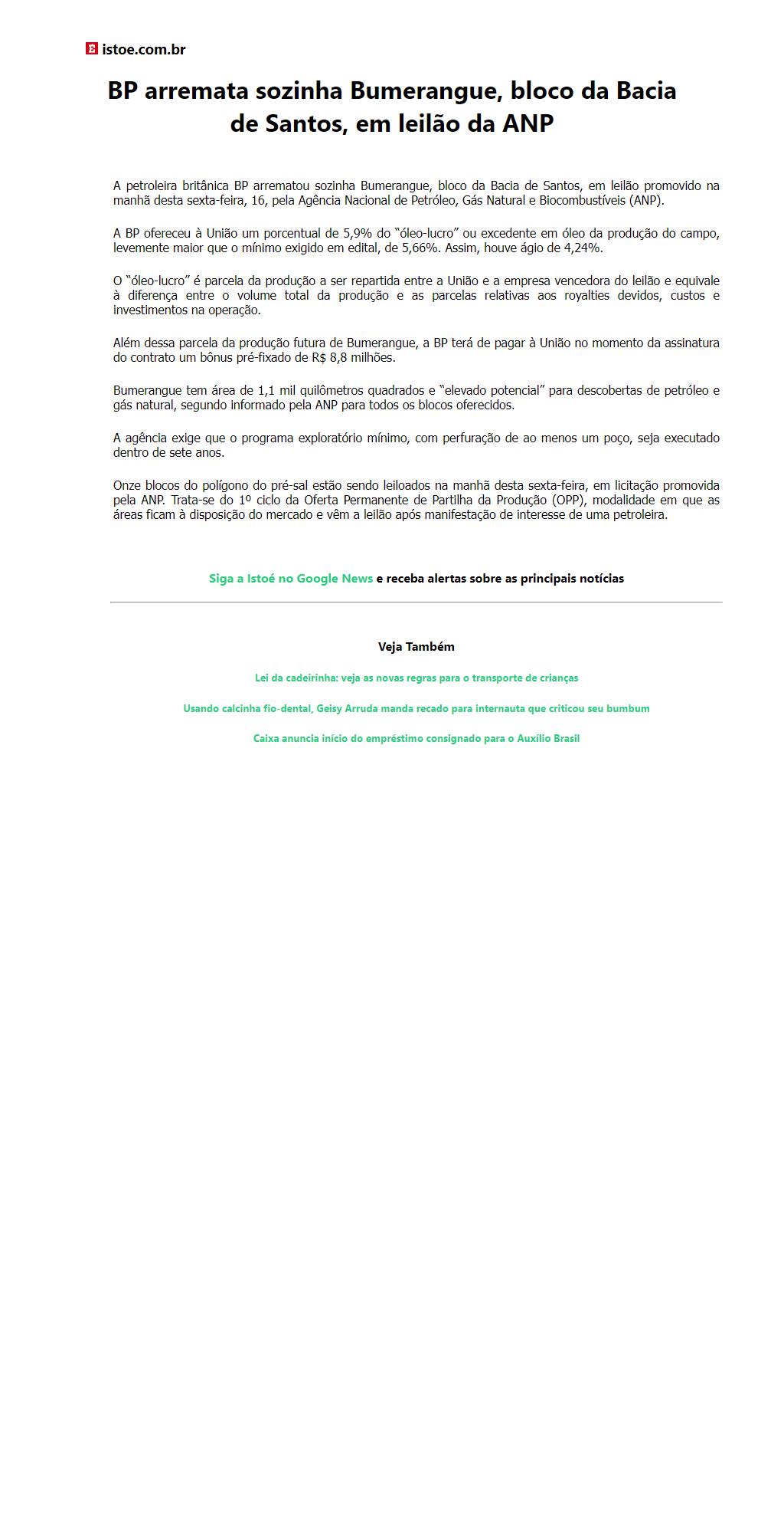 BP arremata sozinha Bumerangue, bloco da Bacia de Santos, em leilão da ANP