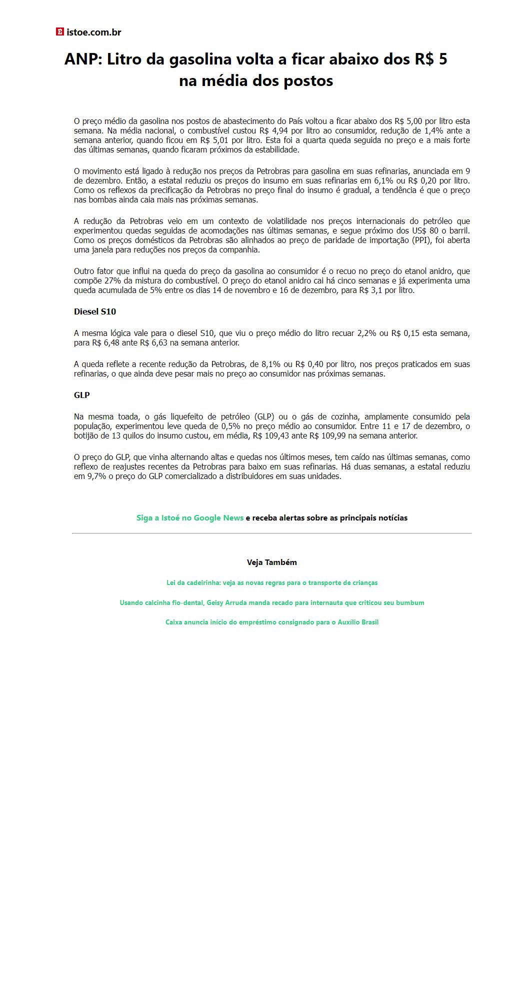 ANP: Litro da gasolina volta a ficar abaixo dos R$ 5 na média dos postos