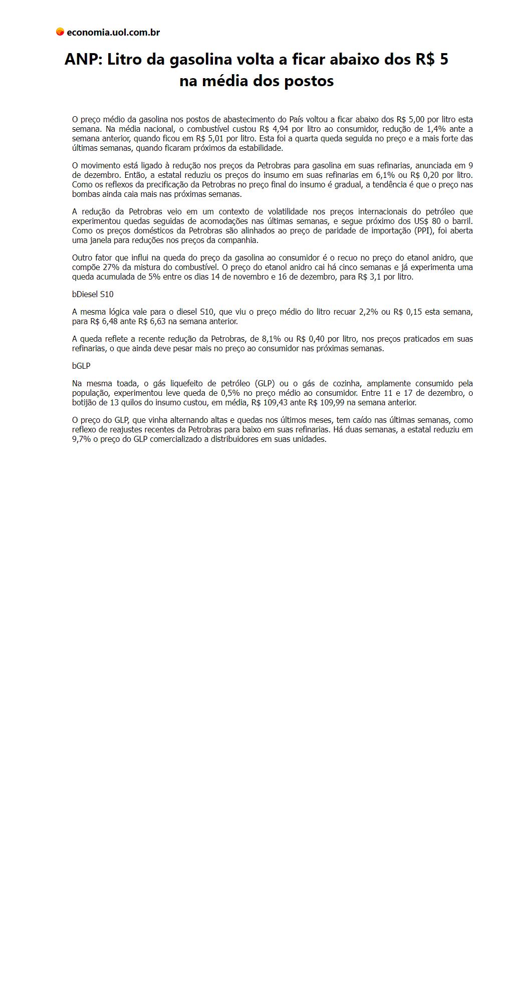 ANP: Litro da gasolina volta a ficar abaixo dos R$ 5 na média dos postos