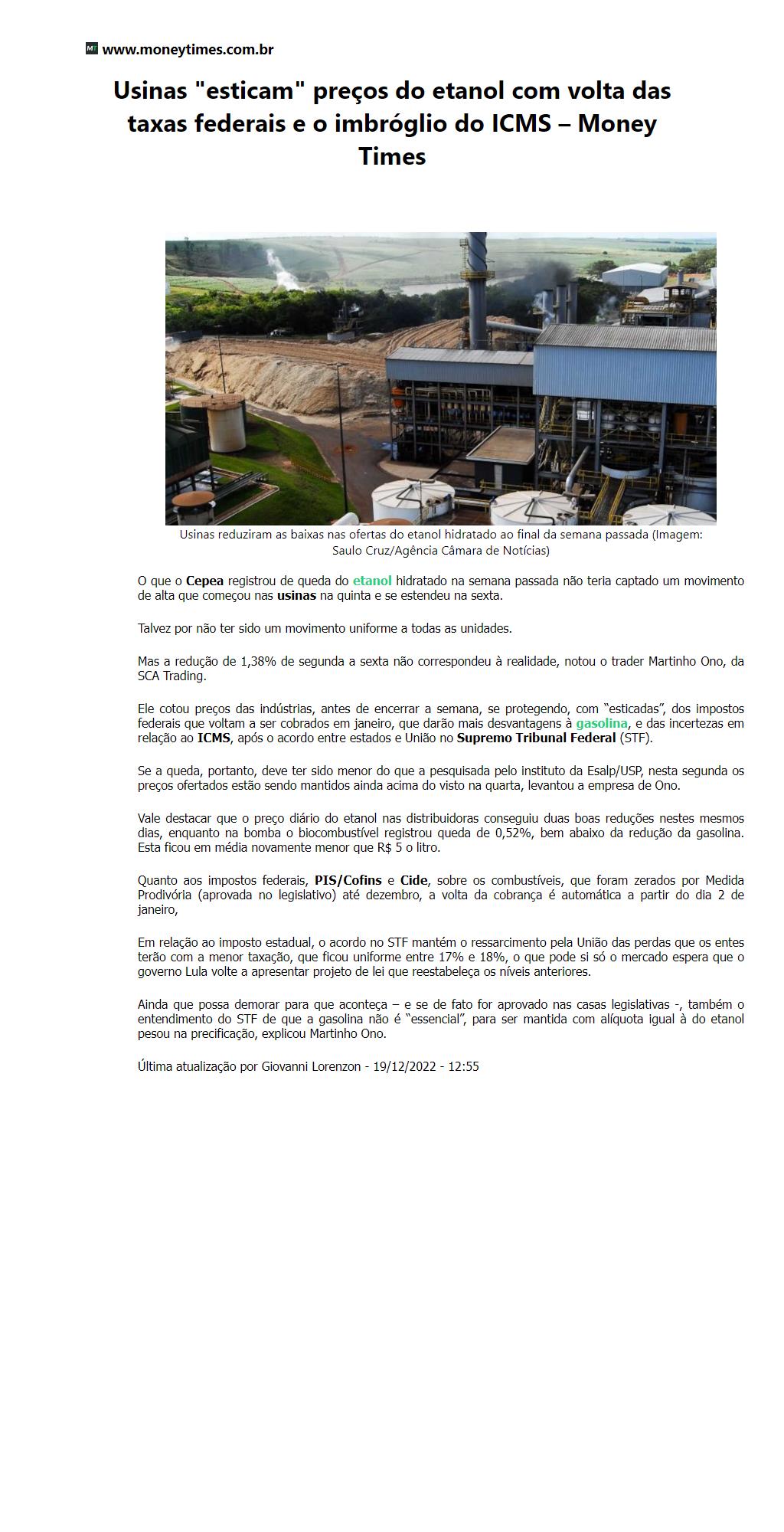 Usinas "esticam" preços do etanol com volta das taxas federais e o imbróglio do ICMS Money Times