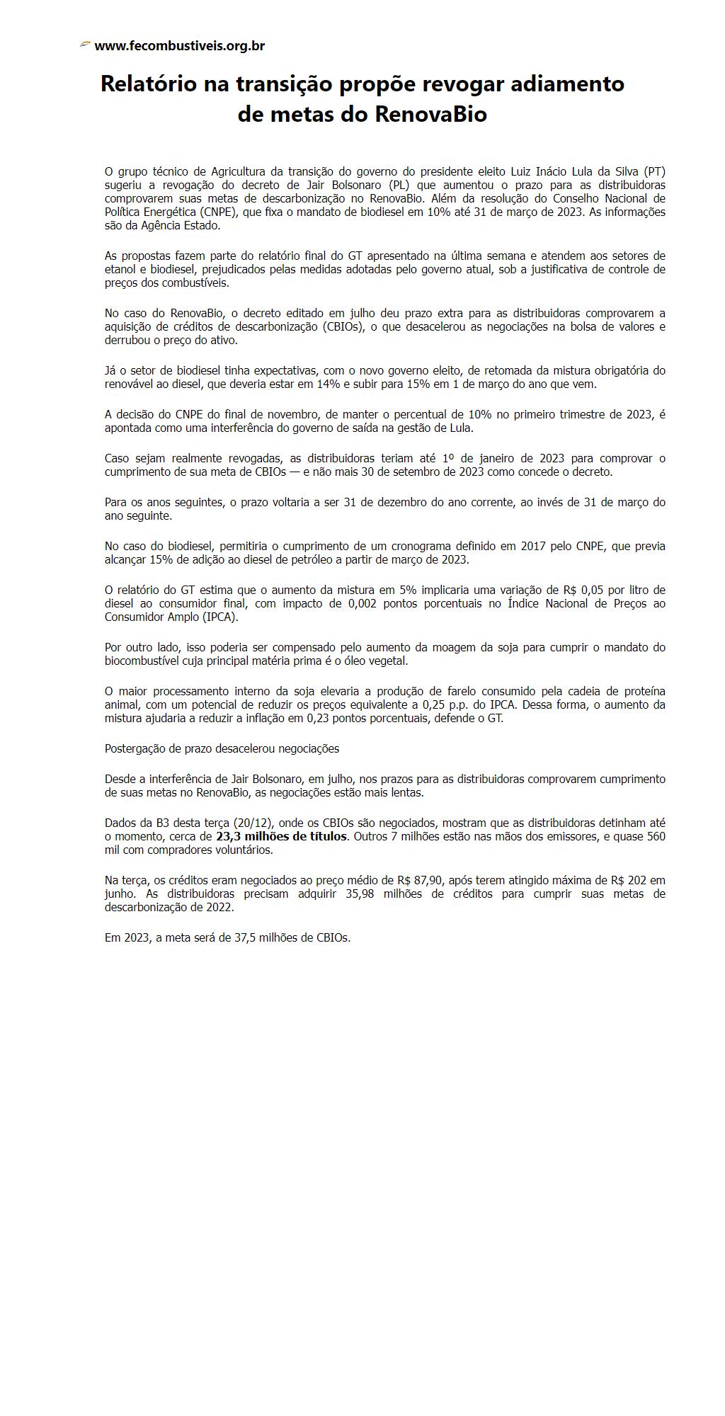 Relatório na transição propõe revogar adiamento de metas do RenovaBio