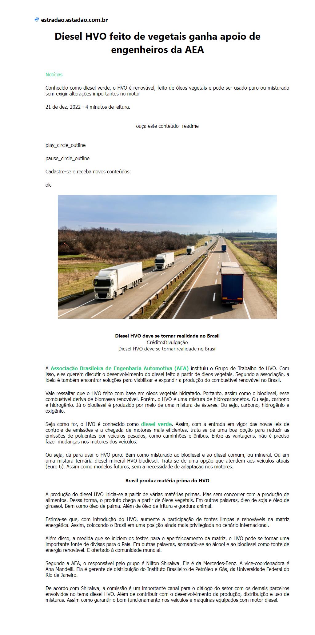 Diesel HVO feito de vegetais ganha apoio de engenheiros da AEA