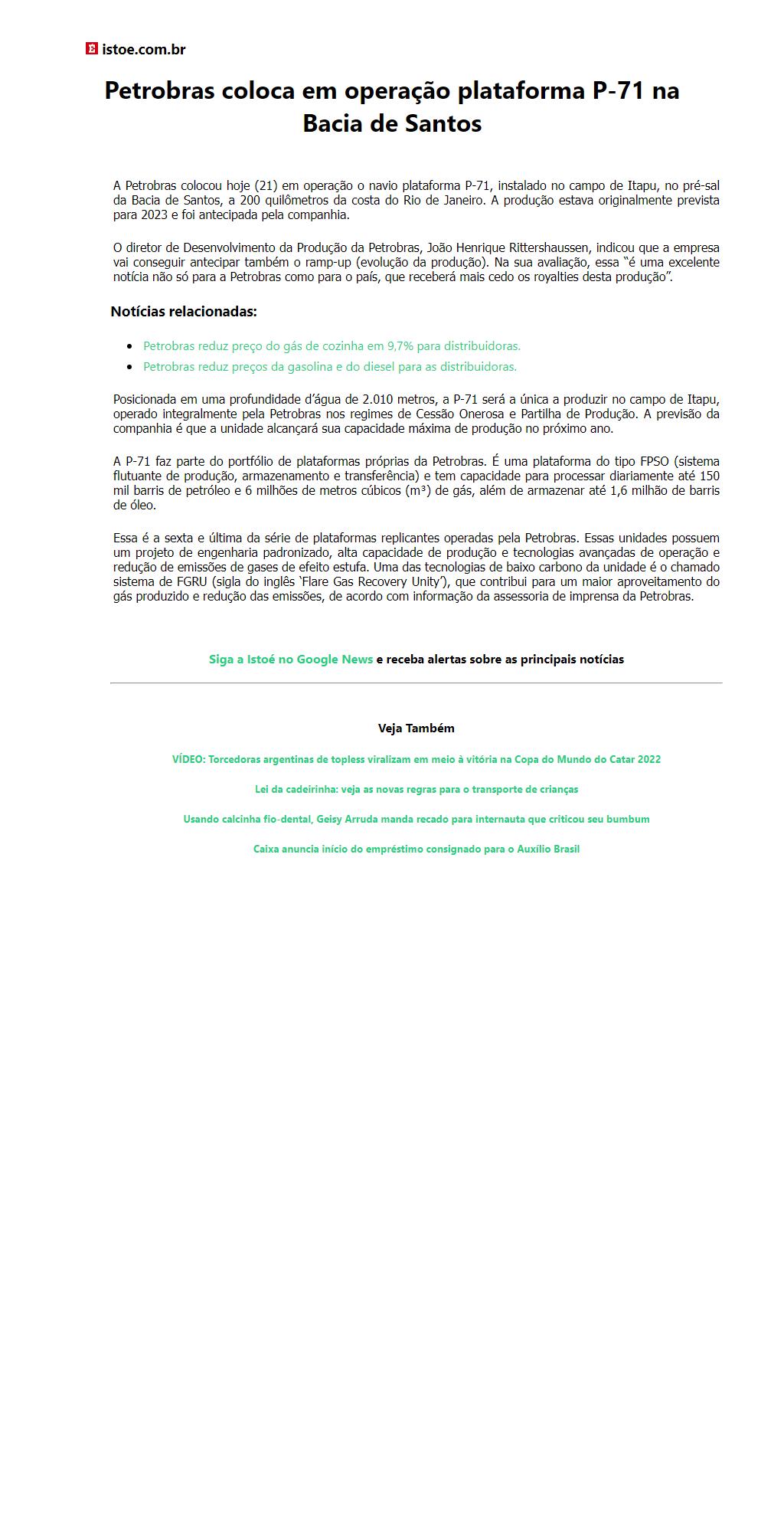 Petrobras coloca em operação plataforma P-71 na Bacia de Santos