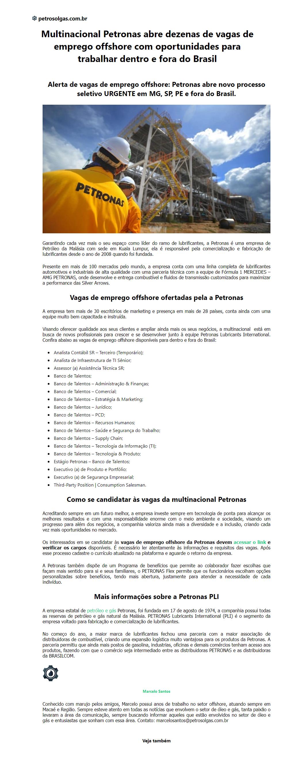 Multinacional Petronas abre dezenas de vagas de emprego offshore com oportunidades para trabalhar dentro e fora do Brasi