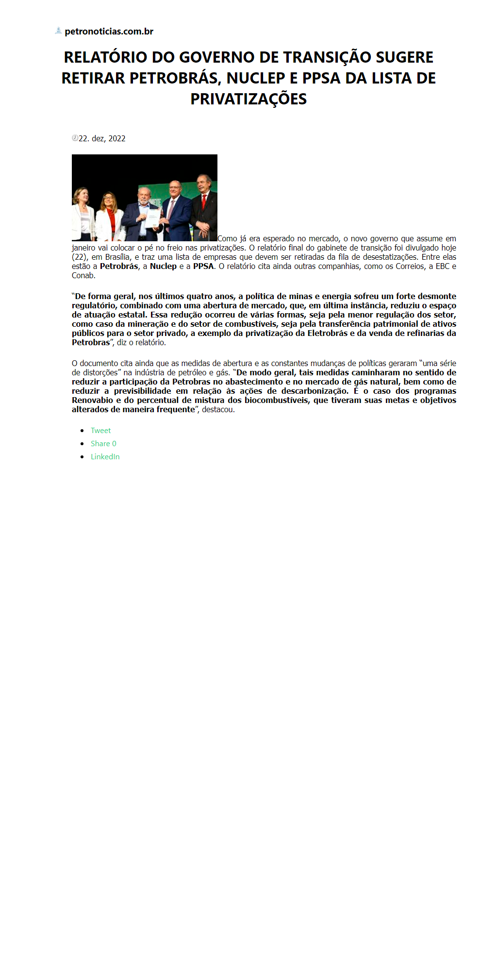 RELATÓRIO DO GOVERNO DE TRANSIÇÃO SUGERE RETIRAR PETROBRÁS, NUCLEP E PPSA DA LISTA DE PRIVATIZAÇÕES