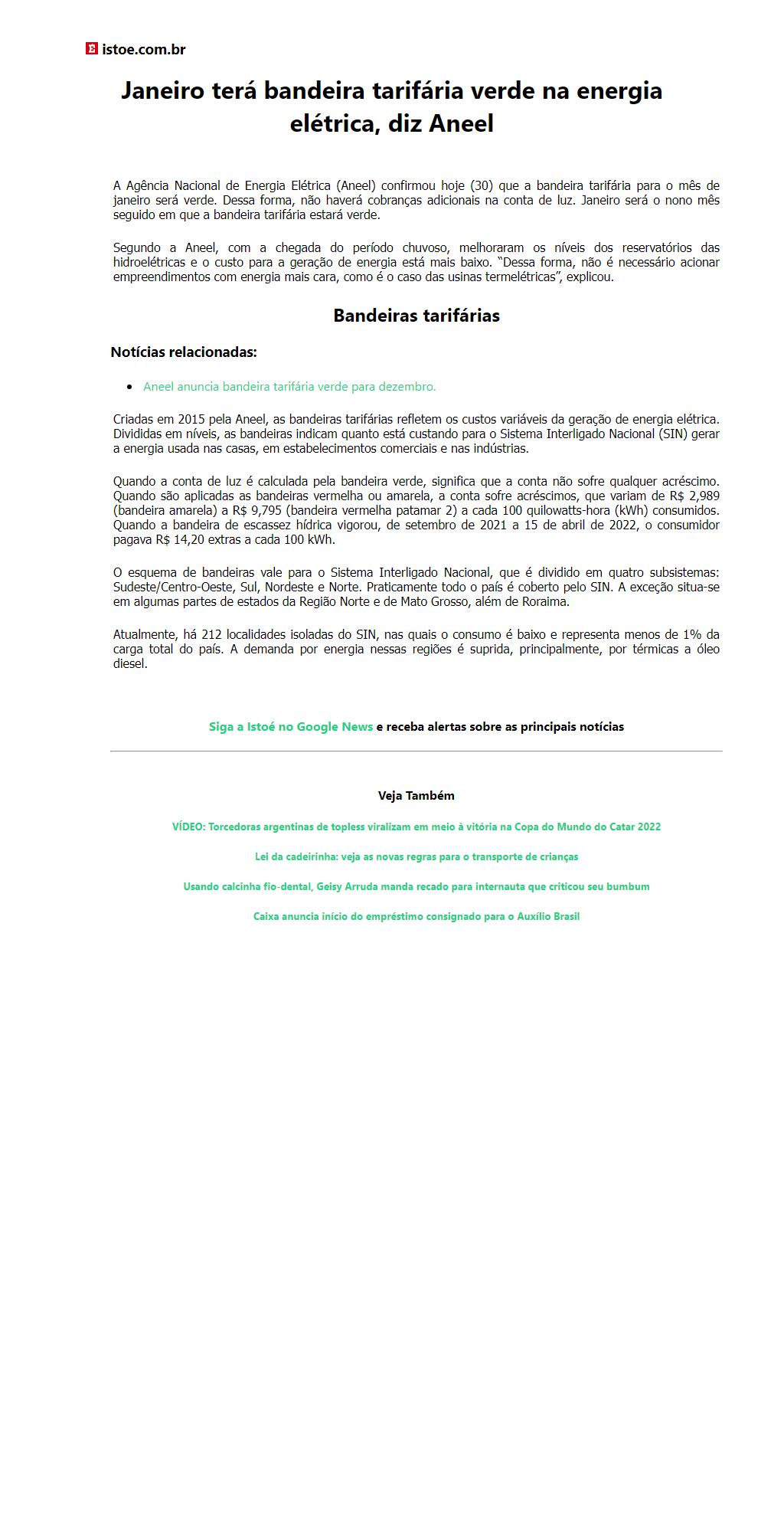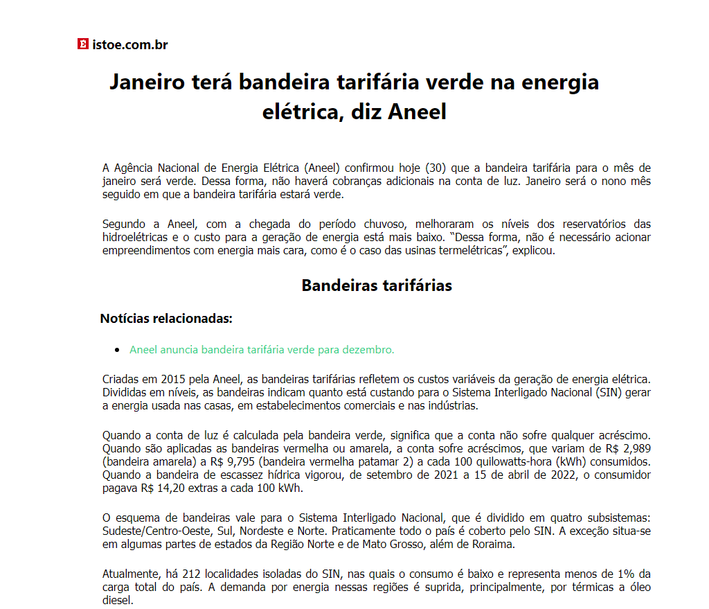 Janeiro terá bandeira tarifária verde na energia elétrica, diz Aneel