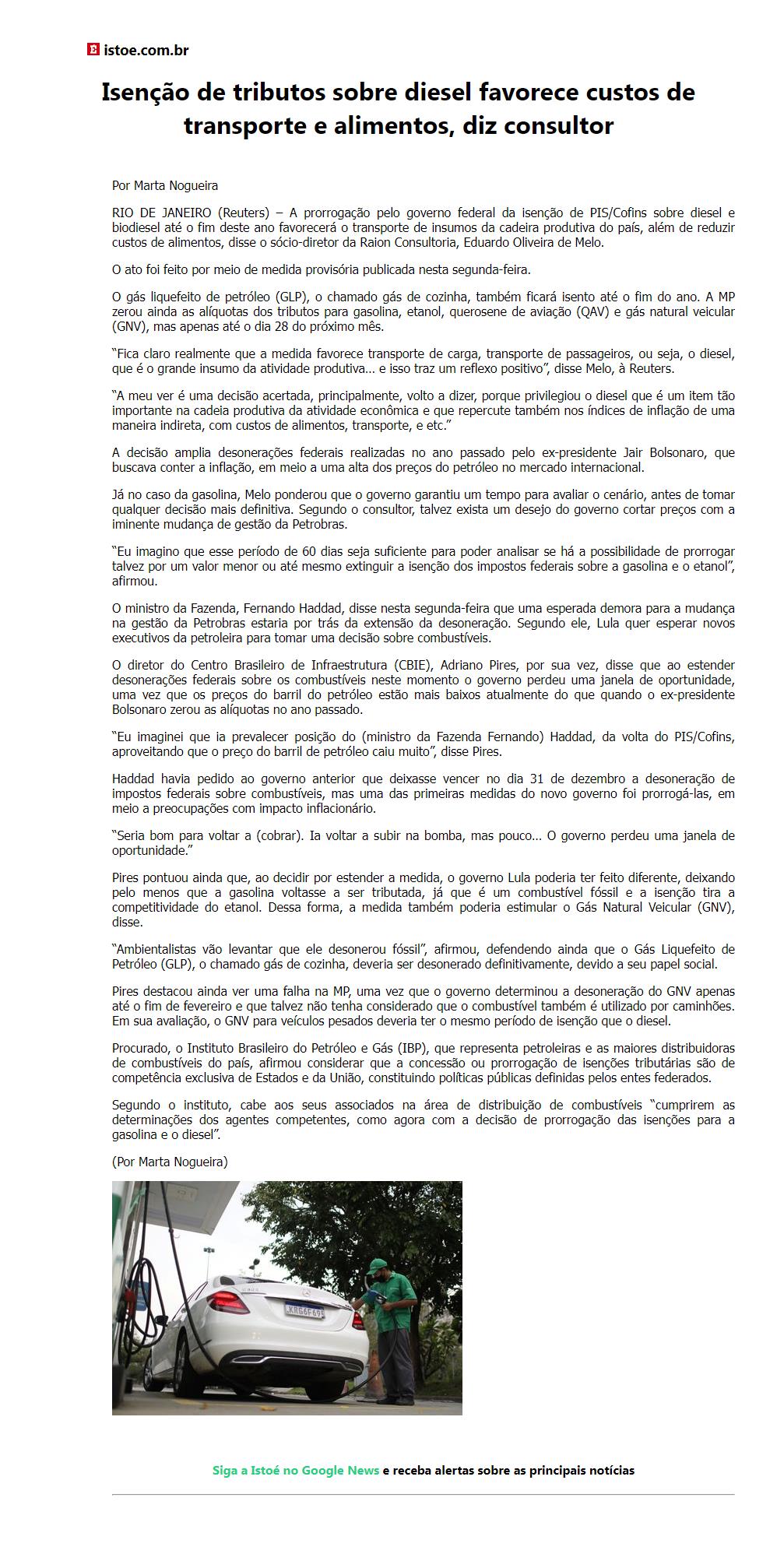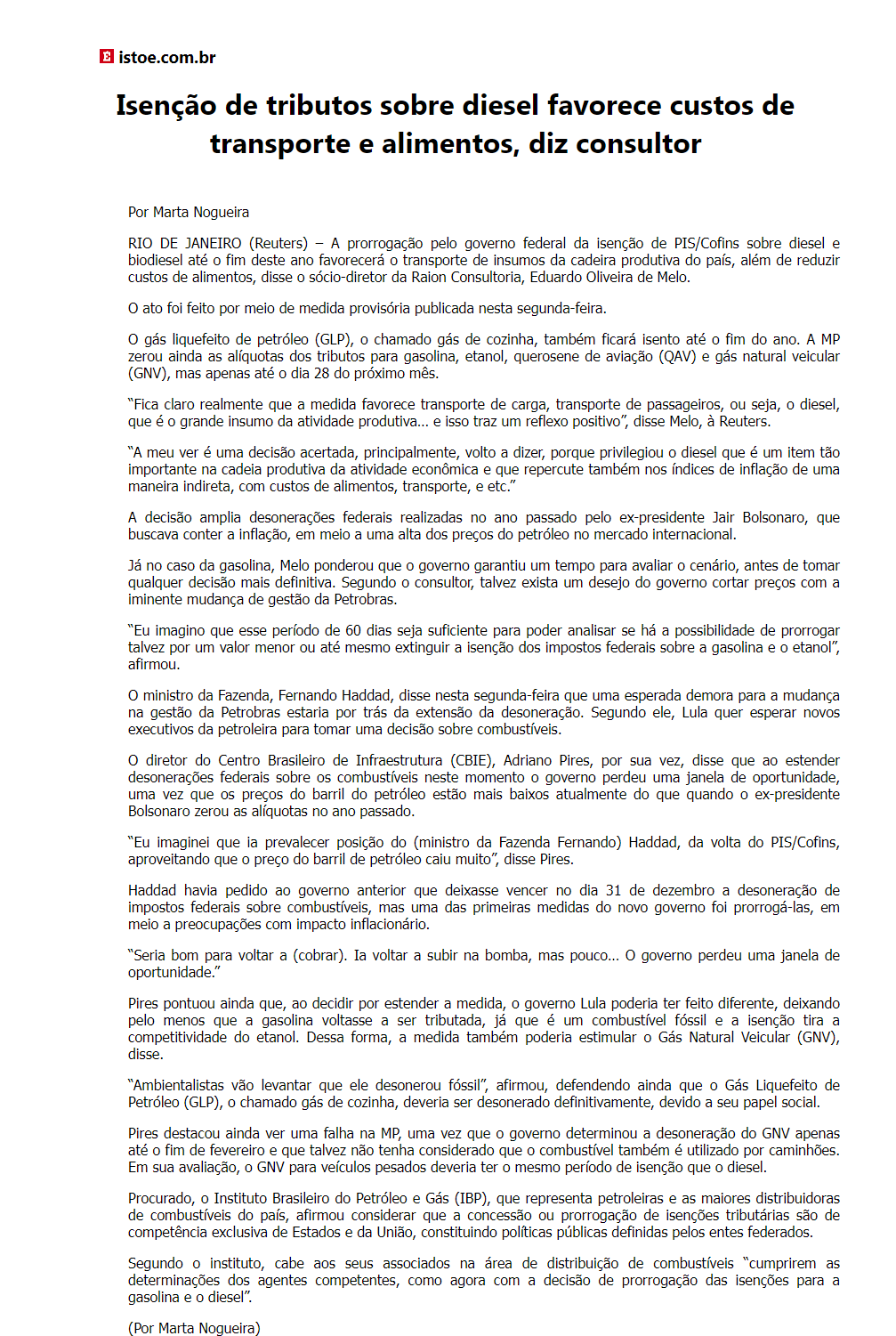 Isenção de tributos sobre diesel favorece custos de transporte e alimentos, diz consultor