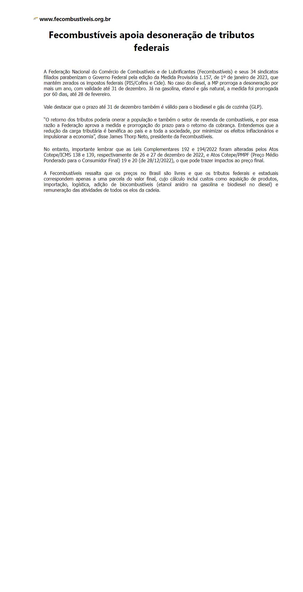 Fecombustíveis apoia desoneração de tributos federais