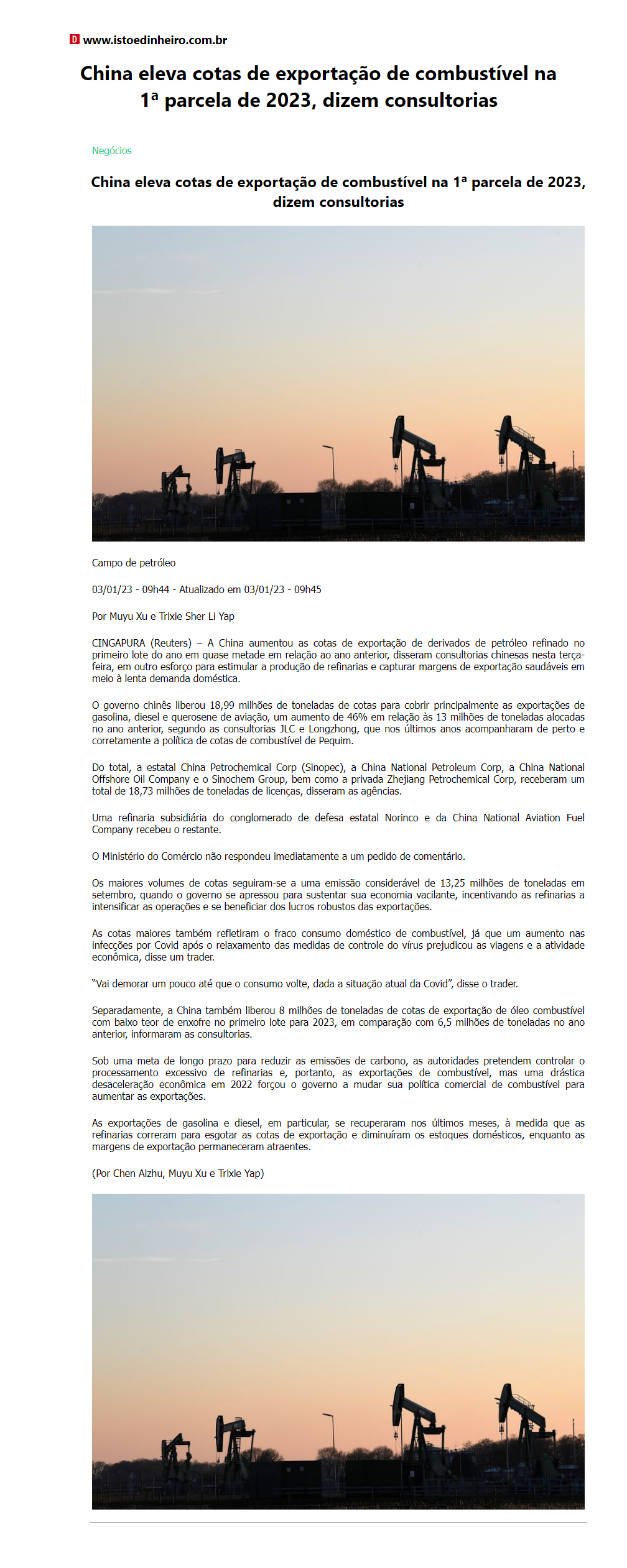 China eleva cotas de exportação de combustível na 1ª parcela de 2023, dizem consultorias