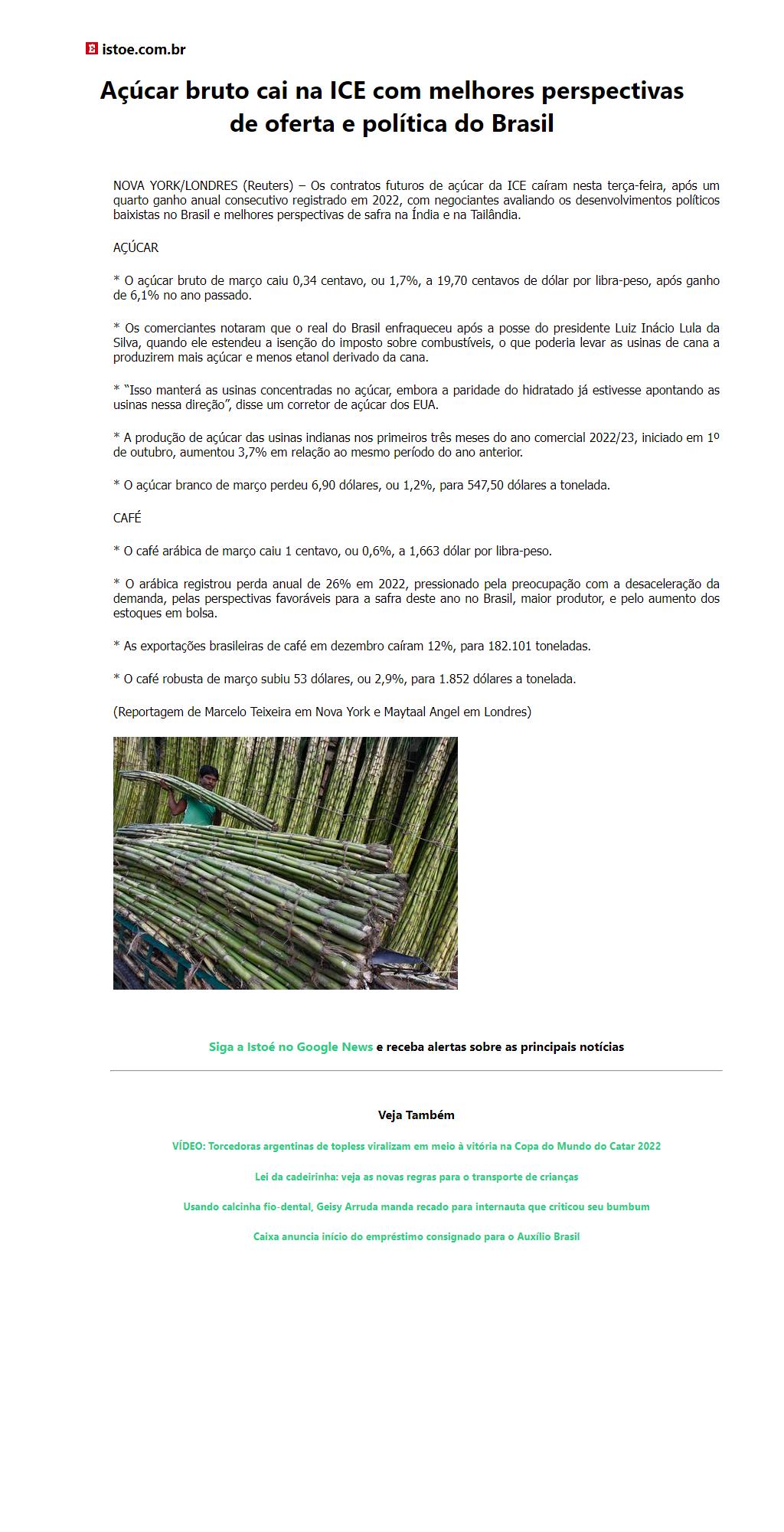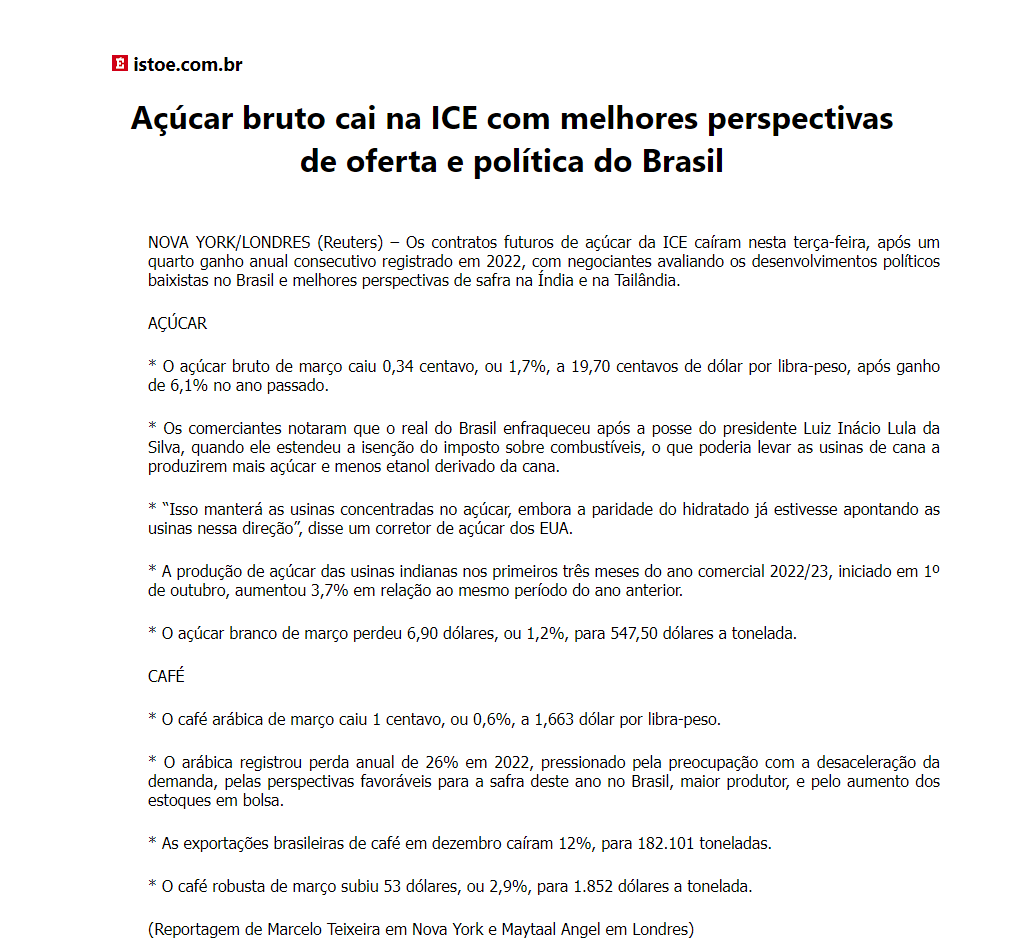 Açúcar bruto cai na ICE com melhores perspectivas de oferta e política do Brasil